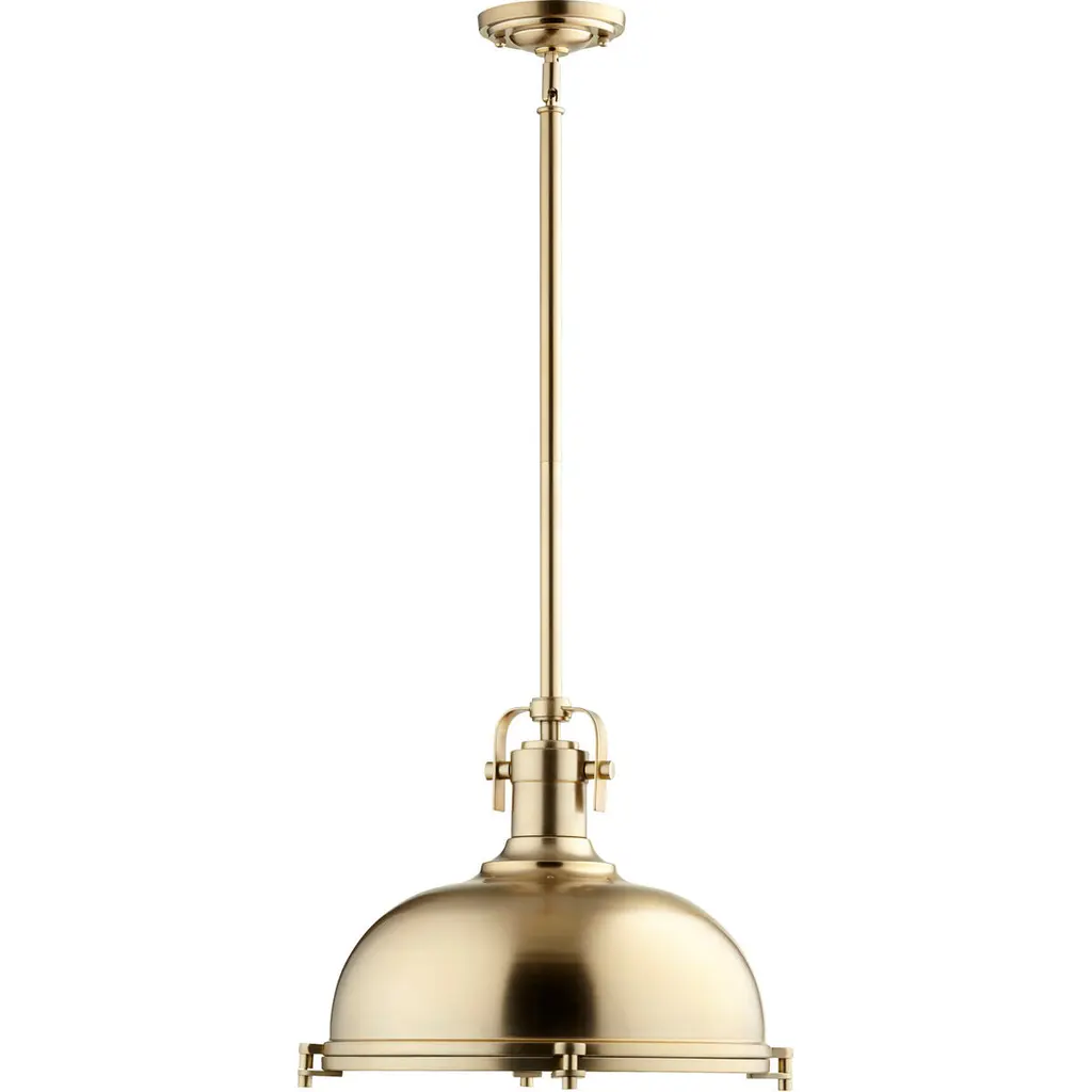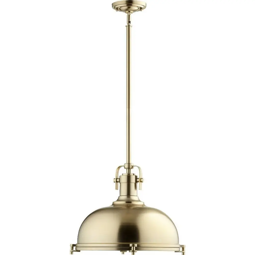 Modern industrial at its finest. Flood your kitchen island with the generous light coming from the adjustable Hinge Pendant by Quorum International. The bold, mechanical quality jumps off the edges of this eye-catching piece as a silhouette defining hinge lets you tweak the direction of the light. Its sumptuous figure is emphasized by the gentle curves of a dome shade, plated on the bottom with a glass diffuser. Downlight streams through the opaque plate for a modern treat.