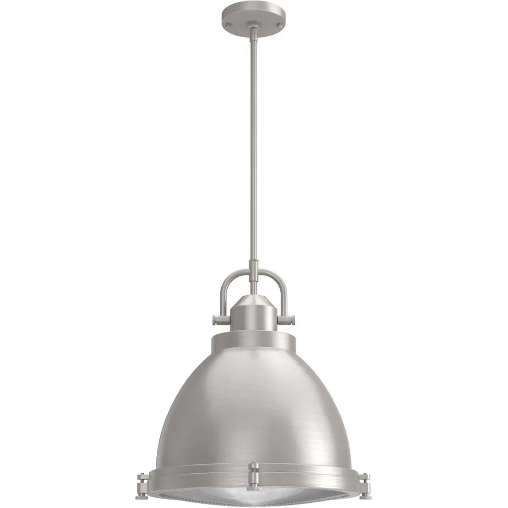 Modern industrial at its finest. Flood your kitchen island with the generous light coming from the adjustable Hinge Pendant by Quorum International. The bold, mechanical quality jumps off the edges of this eye-catching piece as a silhouette defining hinge lets you tweak the direction of the light. Its sumptuous figure is emphasized by the gentle curves of a dome shade, plated on the bottom with a glass diffuser. Downlight streams through the opaque plate for a modern treat.