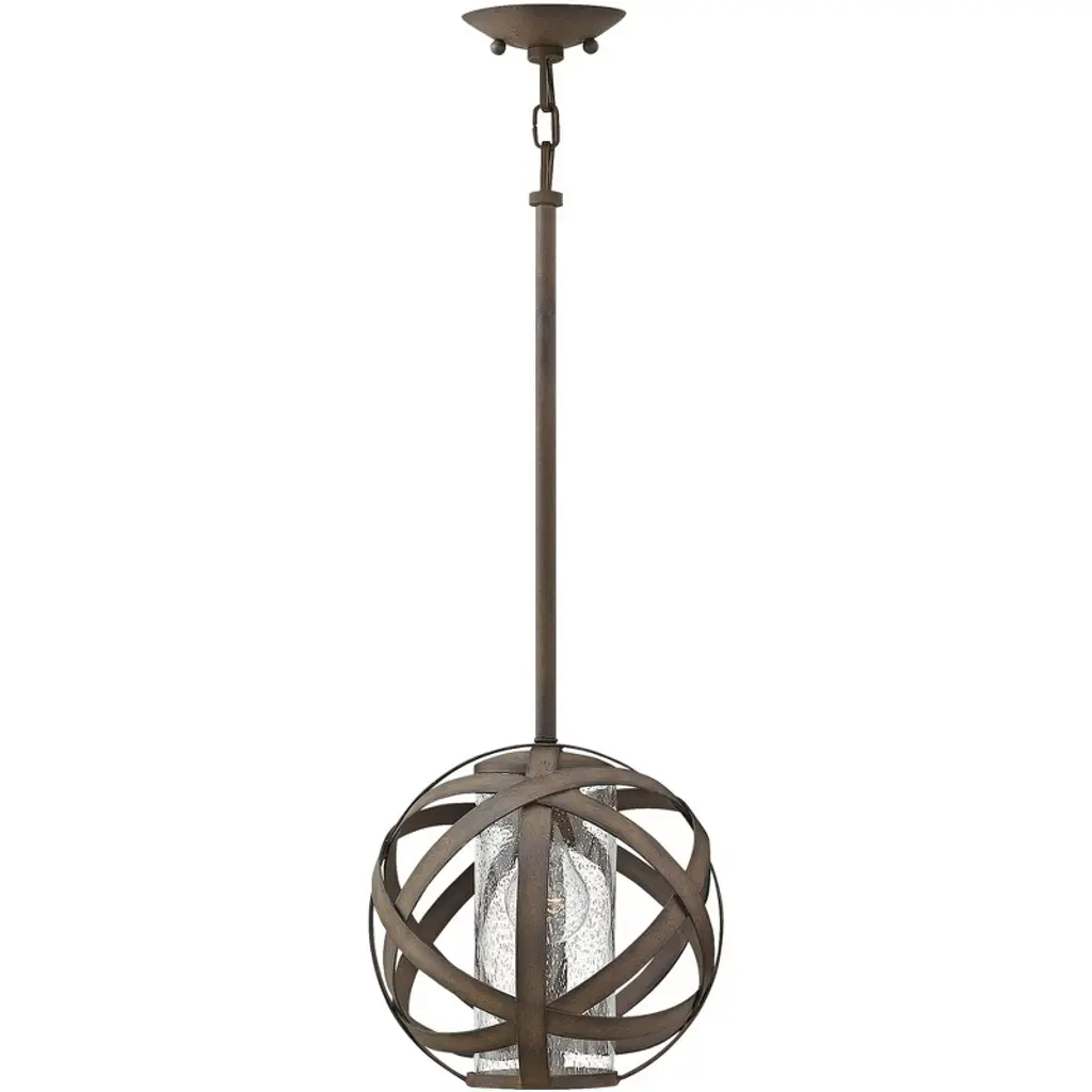 With an eye-catching silhouette reminiscent of an atomic orb, this vintage iron metal outdoor mini-pendant creates stylish options for an updated industrial-themed space. Hand-made by crafters from Hinkley, its ribbon-like strips wrap around an imaginary sphere and offer a shielded view of a clear seedy glass shade. Make a splash in an exterior entertaining space with an artistic fixture inspired from industrial grit.