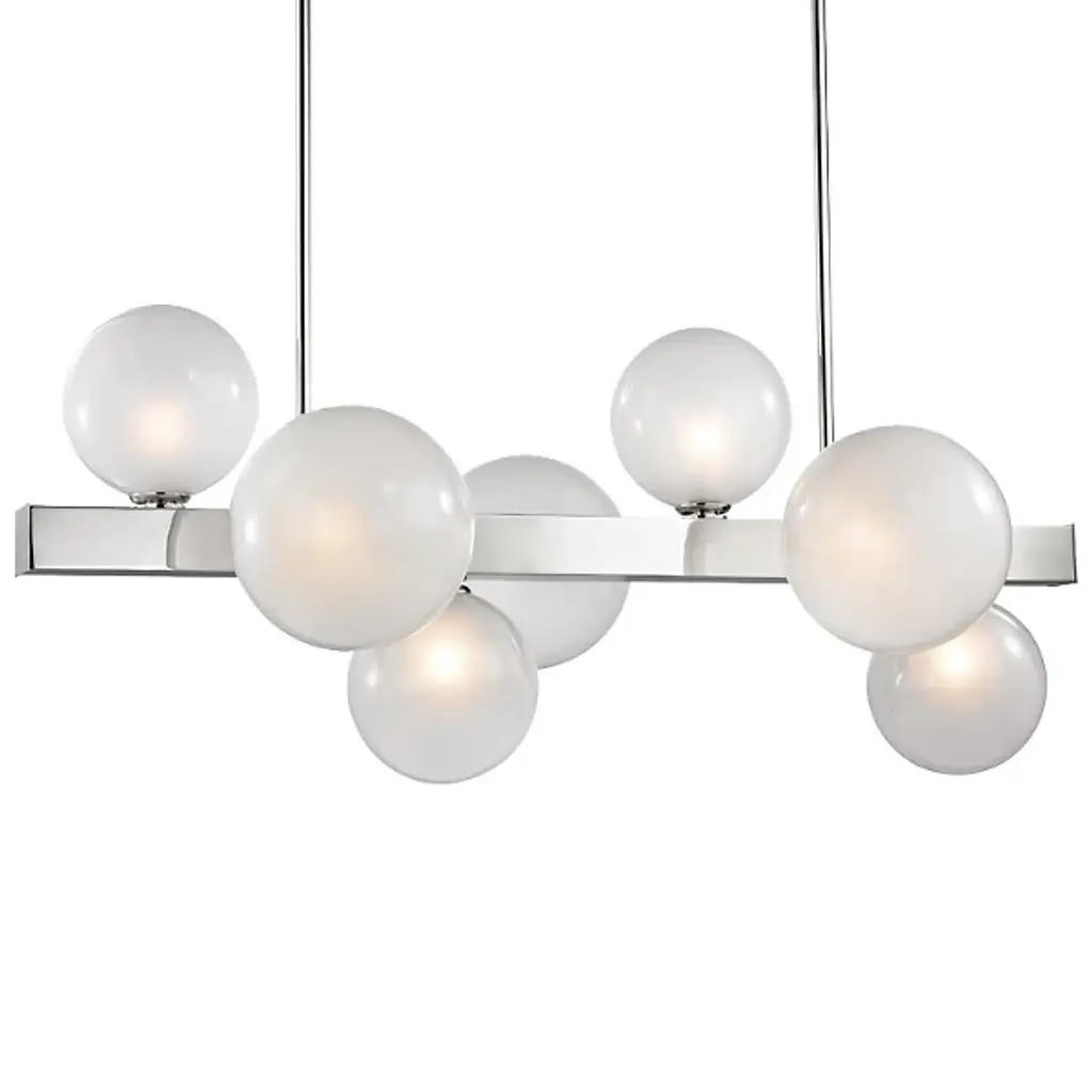 The Hudson Valley Lighting Hinsdale Linear Suspension is playful yet confident and design driven. A cluster of glass orbs of different sizes seemingly float from the metal bar, as if unseen magnetism is at work. The hand blown glass spheres are finely etched on the inside, giving plenty of crevices and avenues for the light to bounce around with a sense of playfulness.
