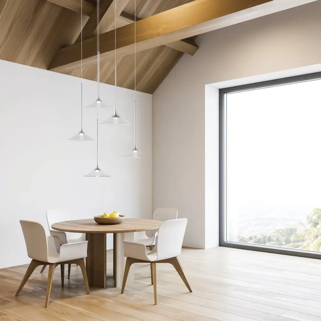 Elongated stems seamlessly transition to a modern cone shaped shade. Encased in the polished chrome stem is a remarkable, high-powered LED that illuminates the crystal clear acrylic cone for a crisp, contemporary lighting design.