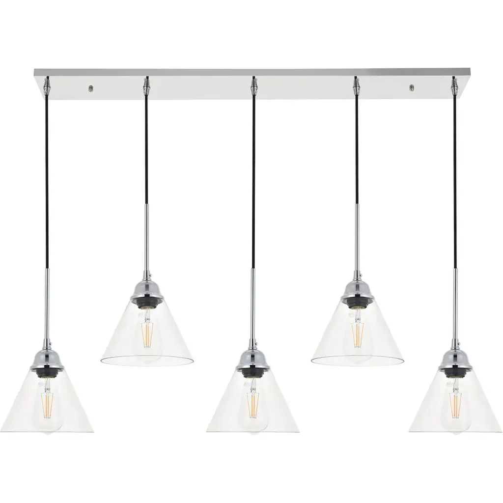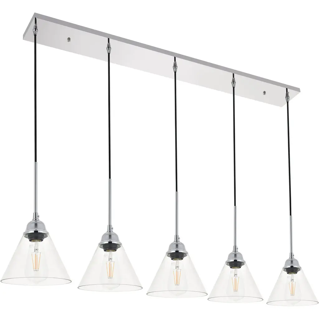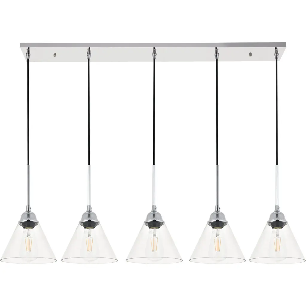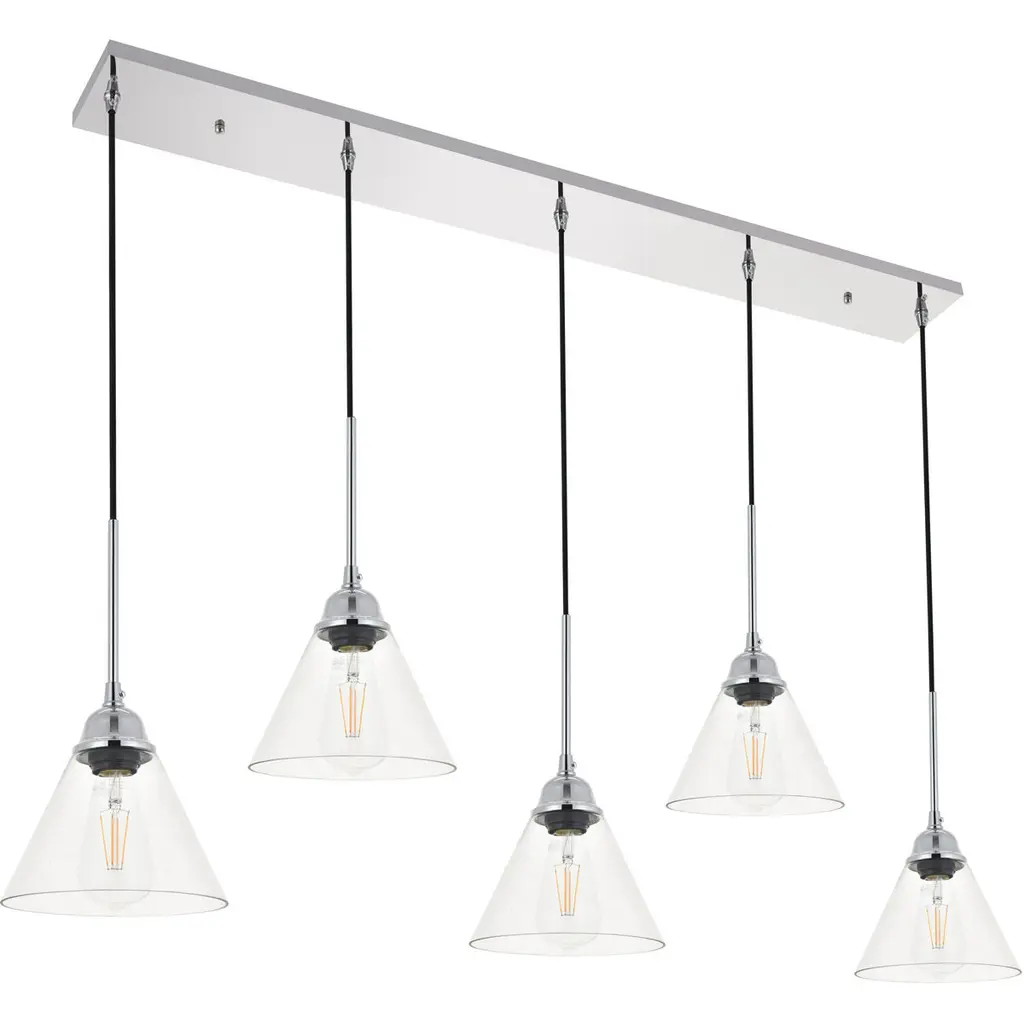 Take a step back through time with the Histoire 5-light pendant lamp in a chrome finish. The ever delightful adjustable cords support the clear glass cone shades while lights illuminate the surrounding area, creating a beautiful display of charm. Hanging 5 in a row, this is the perfect pendant lamp to act as your guide in your foyer or living room, or even to light up your bathroom walls, you will always enjoy its captivating light.