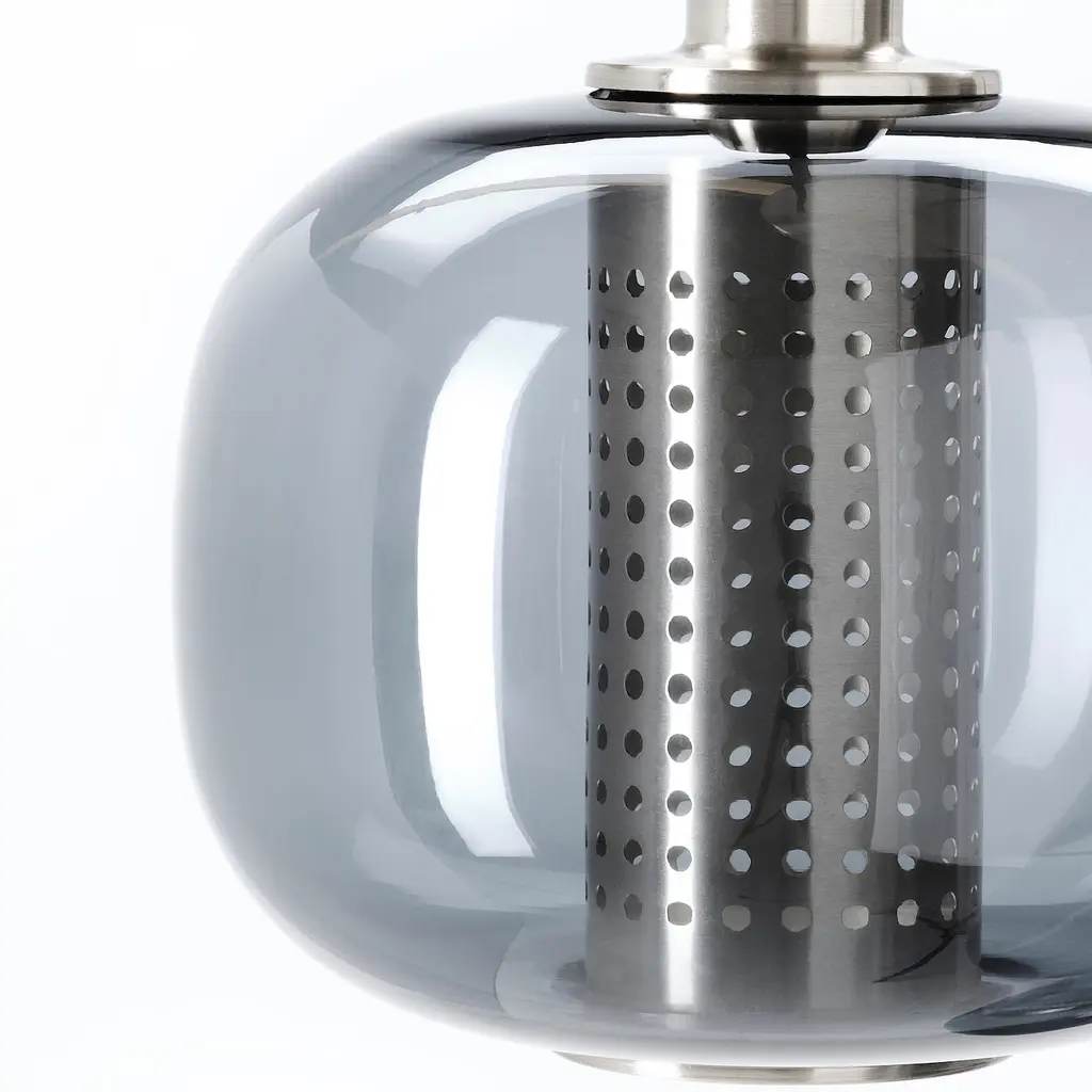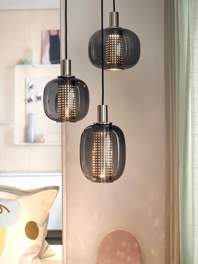 HÖGVIND Pendant lamp with 3 lamps - nickel plated/gray glass 16 ". Inside the pendant lamp's 3 smoke-colored glass shades is a shade made of perforated metal. This provides both pleasant mood lighting and directed light over the surface below.