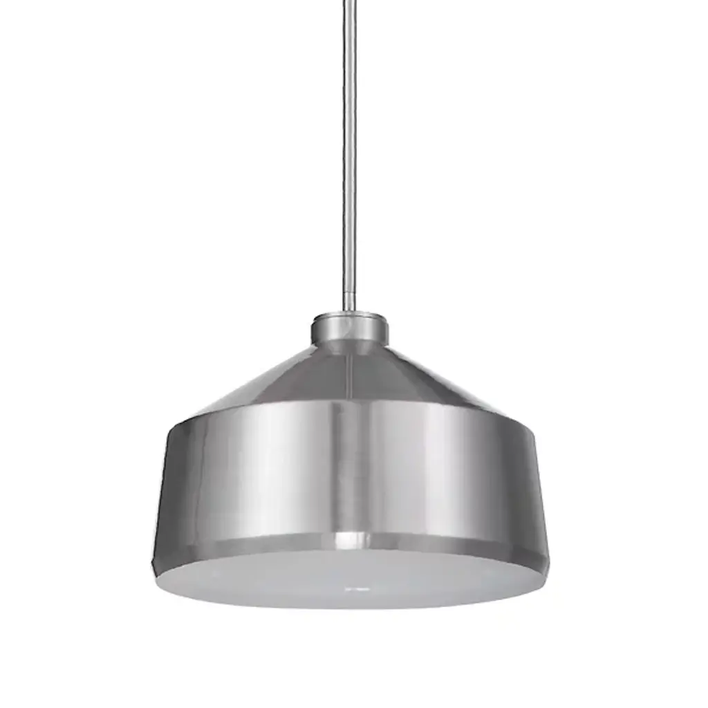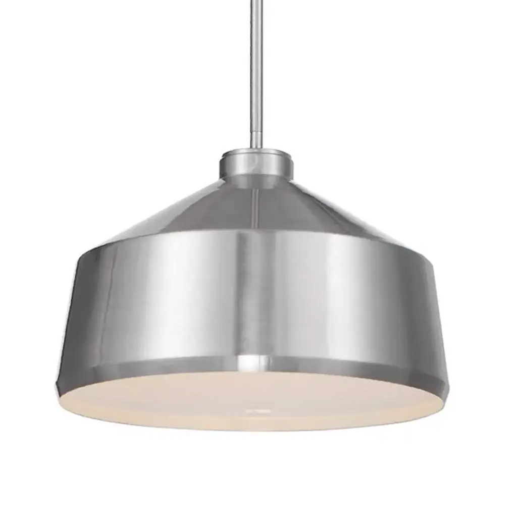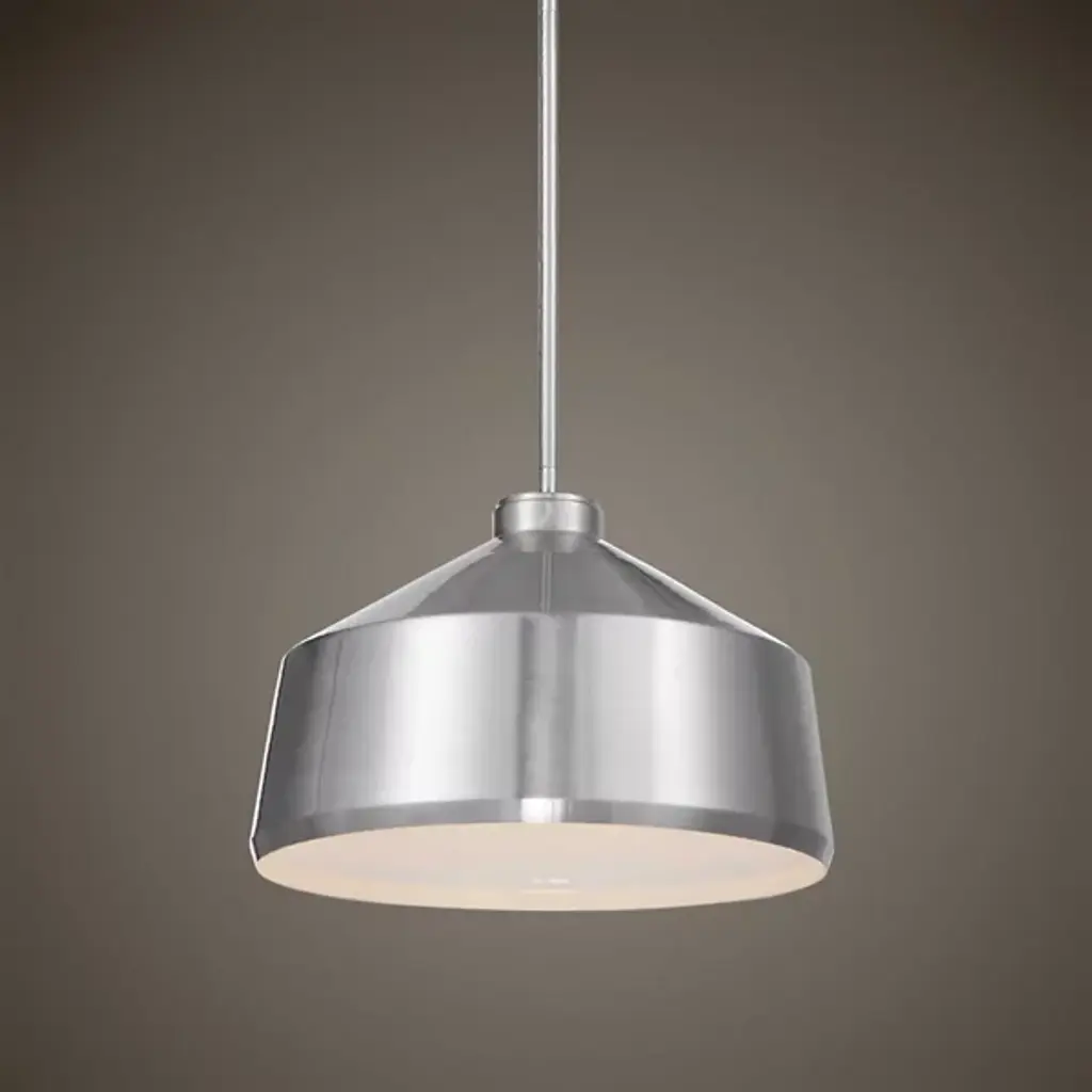 Clean, shining metal instantly becomes the center of attention with the Holgate Pendant from Uttermost. A smooth lined metal shade rests on the end of a matching disc ceiling mount and a slim downrod. With a white interior, the single bulb within the shade is enhanced, spreading a warm, inviting glow that reflects off the interior surface before entering your home. With an adjustable length downrod, this piece is more versatile than at first glance, working with a range of home decors and layouts.