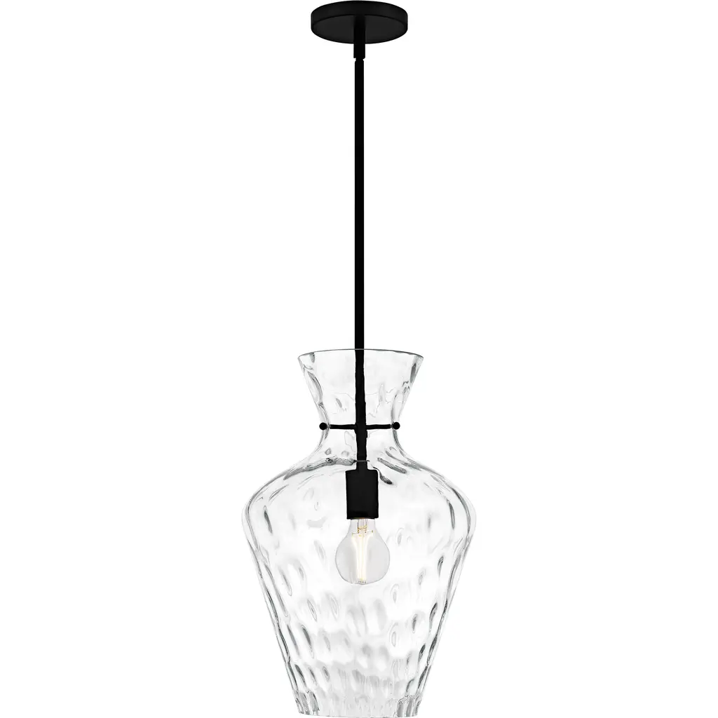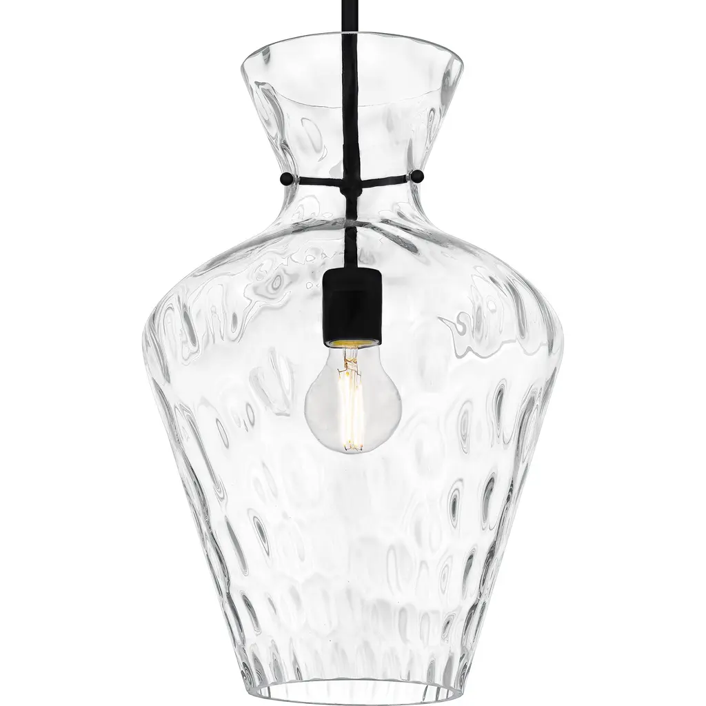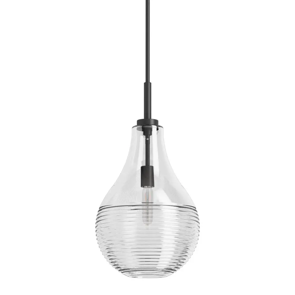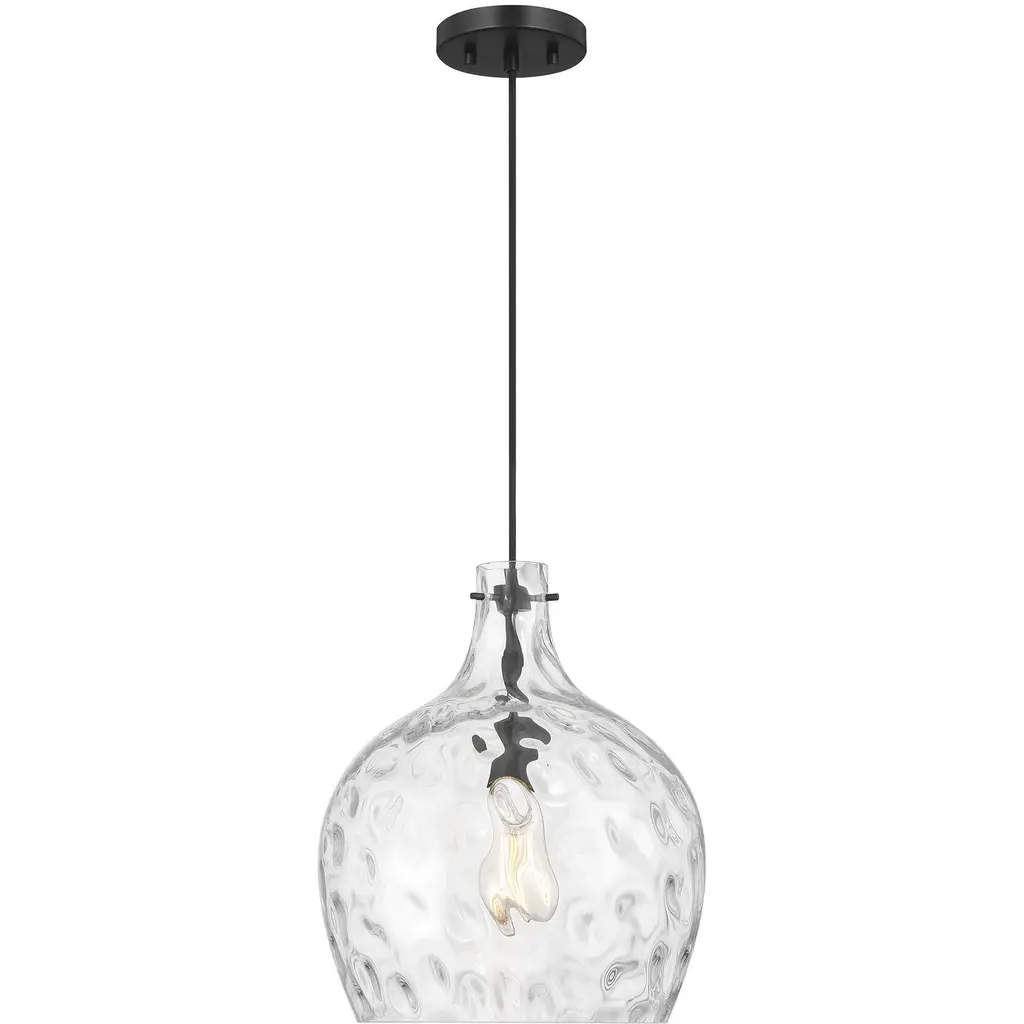 Discover the perfect blend of simplicity and style with the Hollis pendant light. This transitional fixture effortlessly combines classic charm with modern elegance, making it a versatile choice for various interior settings. Available in two sophisticated finishesbrushed nickel or matte blackHollis complements a range of decor styles. The heavy, clear water glass shade adds a touch of texture and sophistication, casting a beautiful, diffused light that enhances the atmosphere of any room.