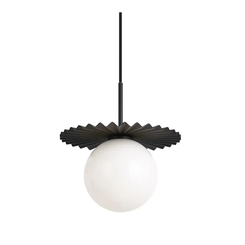 Smooth out the shadows in your living spaces with the Holmenn Pendant by Alder & Ore. A marvelous modern design that starts with a disc ceiling mount and single fabric cord, it uses a short stem to support both a ruffled collar just above and the fixture’s single lamp held below it. The collar gently calls to mind the prominent neck adornments of mid-16th-century European couture, while its angular folds blaze with reflected ambiance from the globe-shaped shade of opal glass that surrounds the lamping.