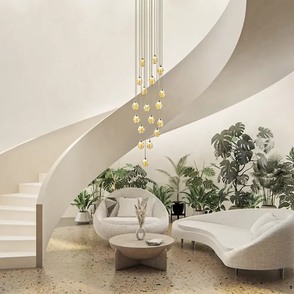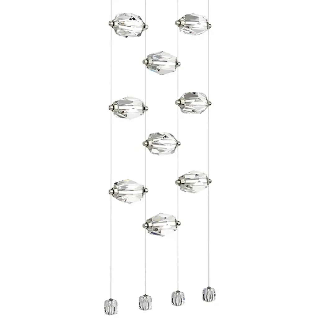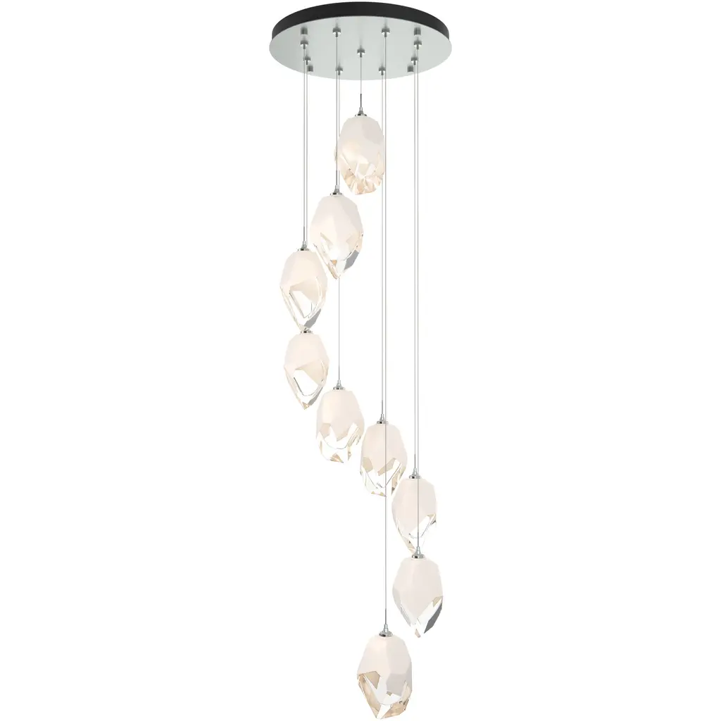 The HoneyComb Square Multi-Light Pendant from Shakuff offers an elegant, orderly ensemble of indoor light best suited to large, high-ceilinged spaces. Inspired by the orderly homes of the humble honeybee, it suspends a series of small, strong lamps via slender cables from a square canopy. Artisan-made with small metal elements and featuring lamping mellowed by thick, round shades of hand-blown, laser-cut glass, the lamps are suspended at different heights, creating a layered, warm radiance enhanced by the diamond-like facets around the bubbled glass of the shade’s center.