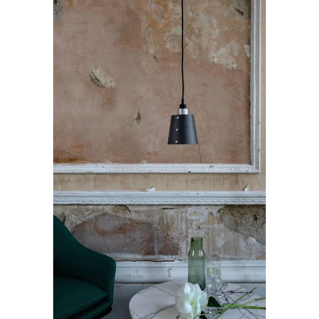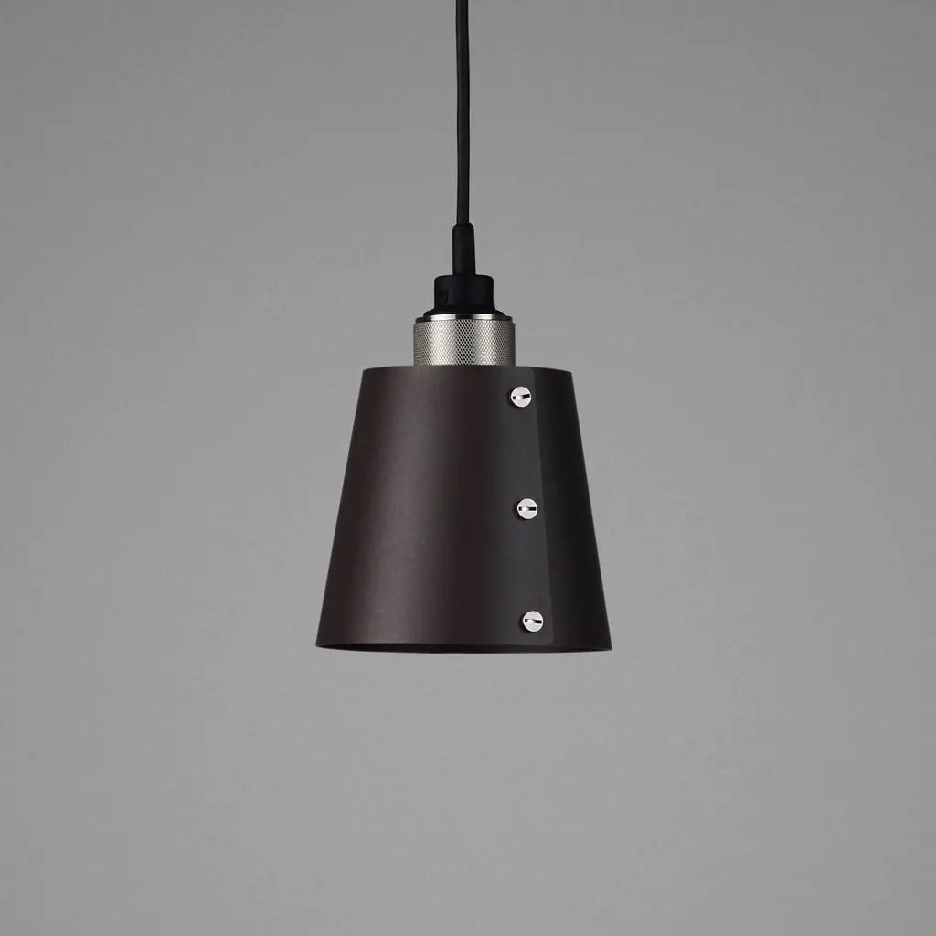 A single light pendant made from solid steel and featuring our signature cross-knurl pattern. Comes with a small shade made from graphite powder coated metal and finished with solid steel coin screws.