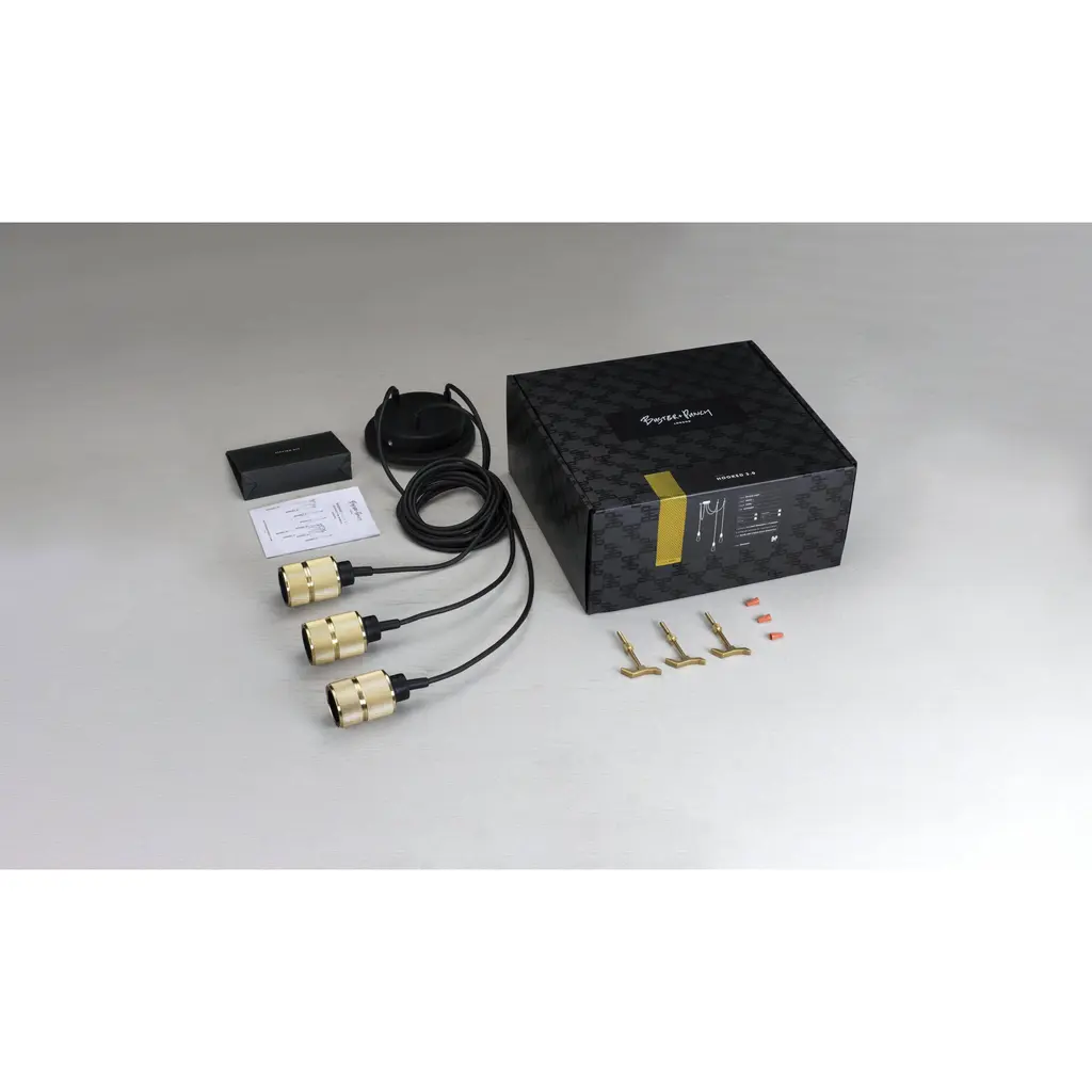 A chandelier made up of three BRASS light pendants, each with their own customising hook, and matte rubber detailing.