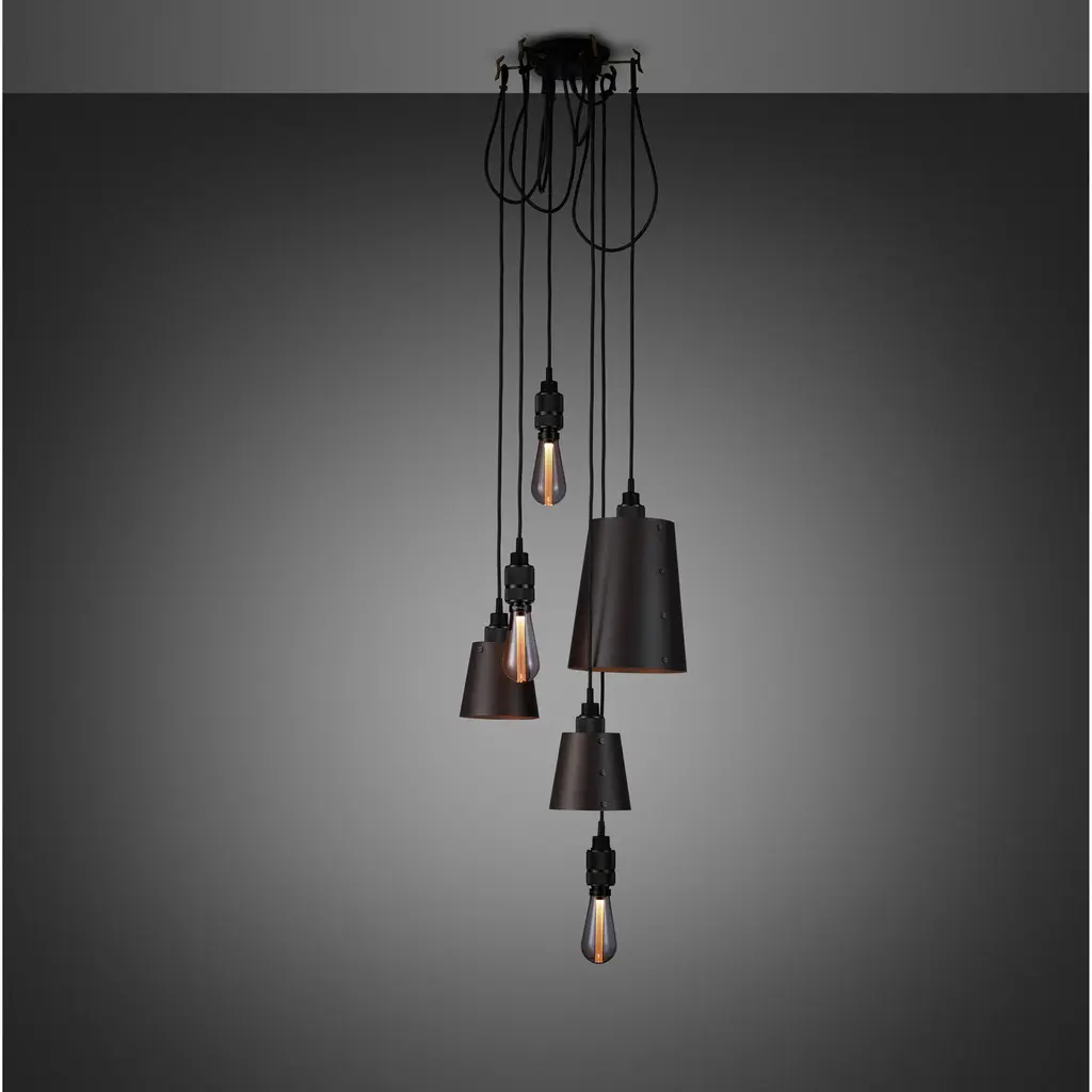 A chandelier made up of six SMOKED BRONZE light pendants, each with their own customising hook, and matte rubber detailing.