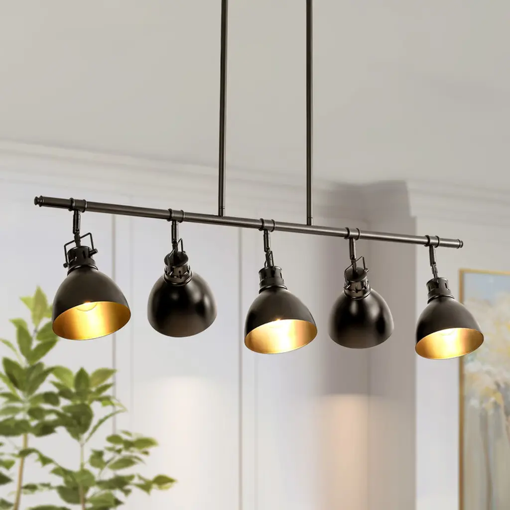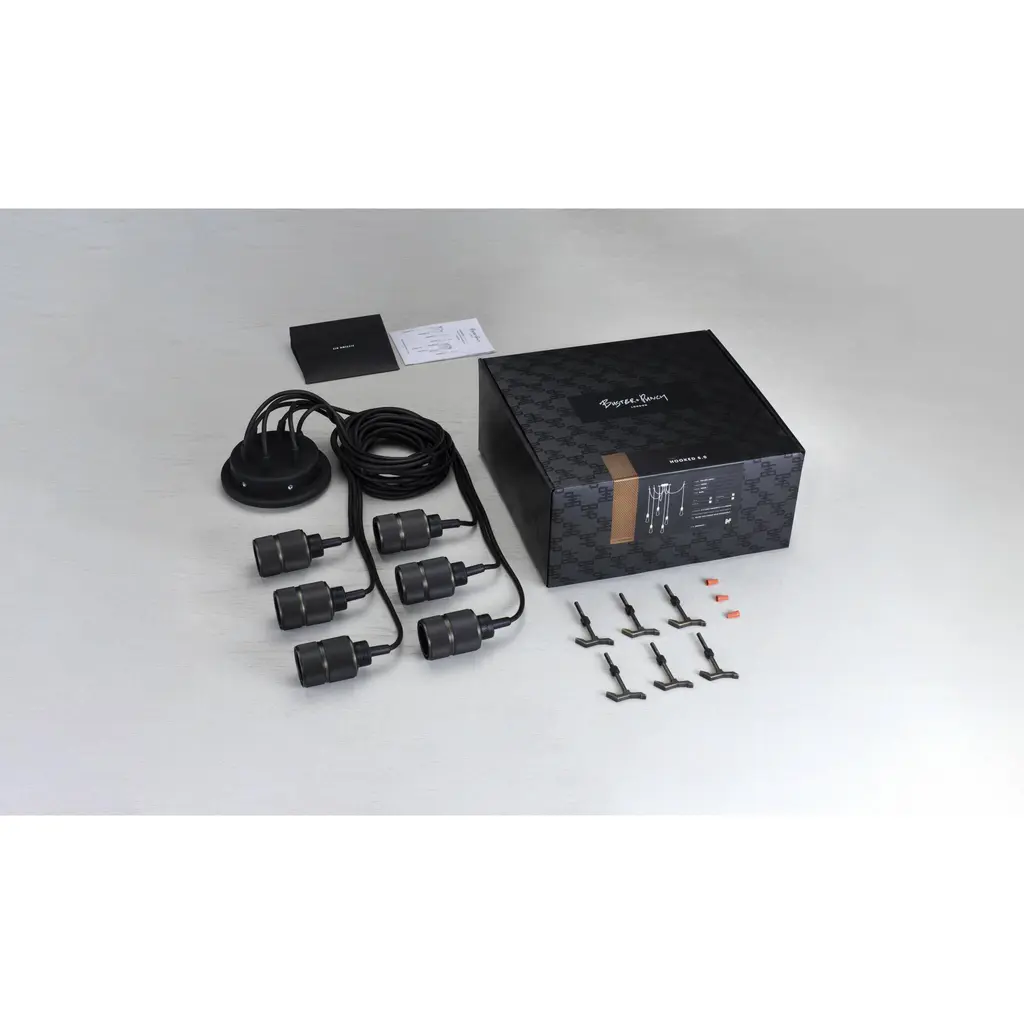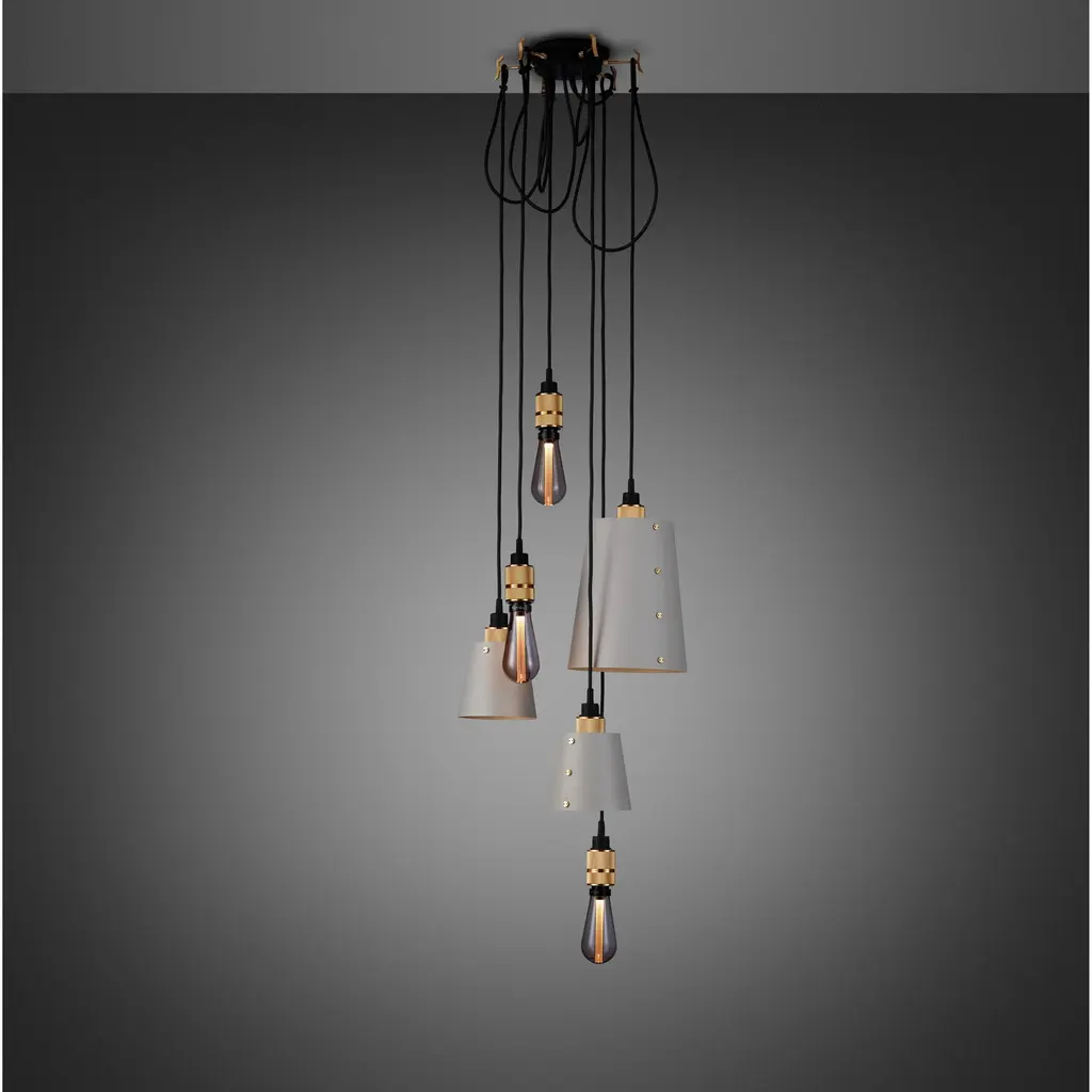 A chandelier made up of six SMOKED BRONZE light pendants, each with their own customising hook, and matte rubber detailing.