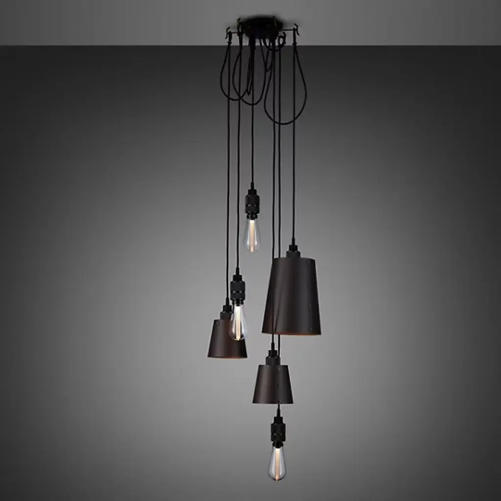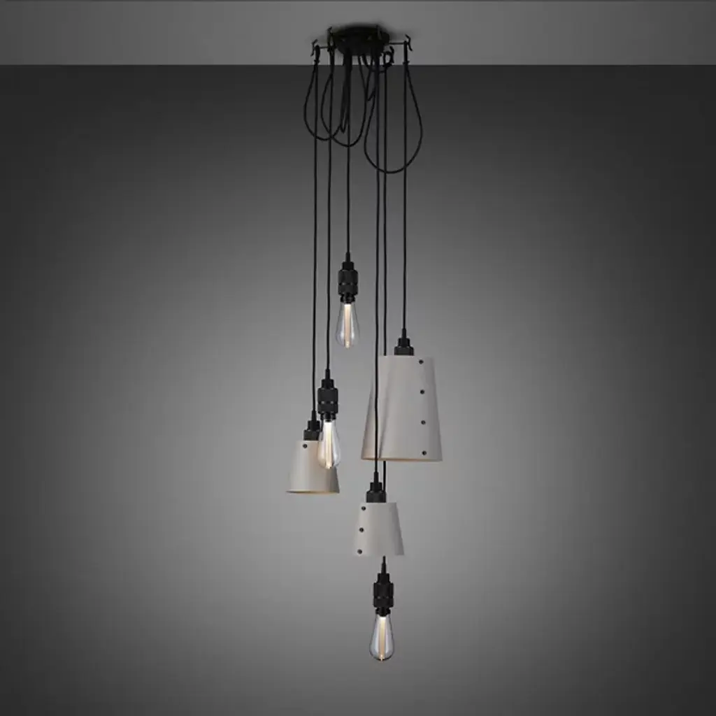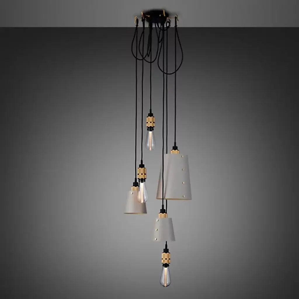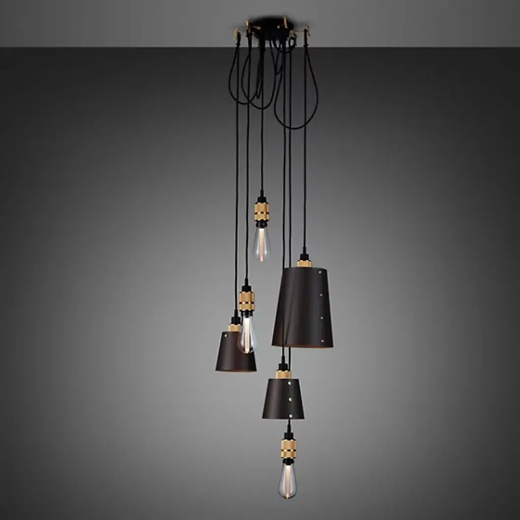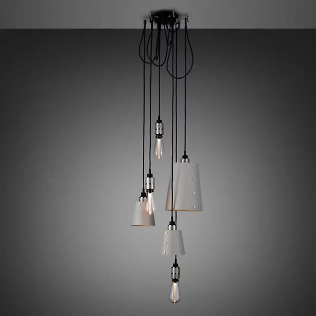 Give a gorgeous enhancement to interiors with the Hooked 6.0 Mix Multi-Light Pendant from Buster + Punch. A mix of simple design elements set in an elegant array, it blooms down from a circular canopy studded with solid metal hooks that reach out evenly in all directions, each hook retaining a single woven cord that loops around it at any desired height and ending in a knurl-accented single socket. The lamping is at once left open and screened by a variety of flared metal shades, maintaining the robust industrial look while creating a cornucopia of ambient light