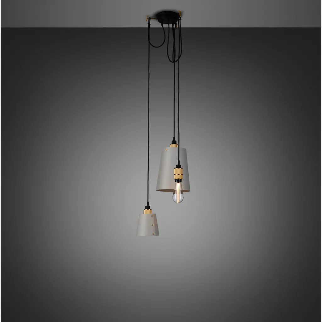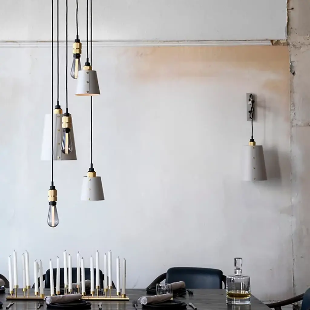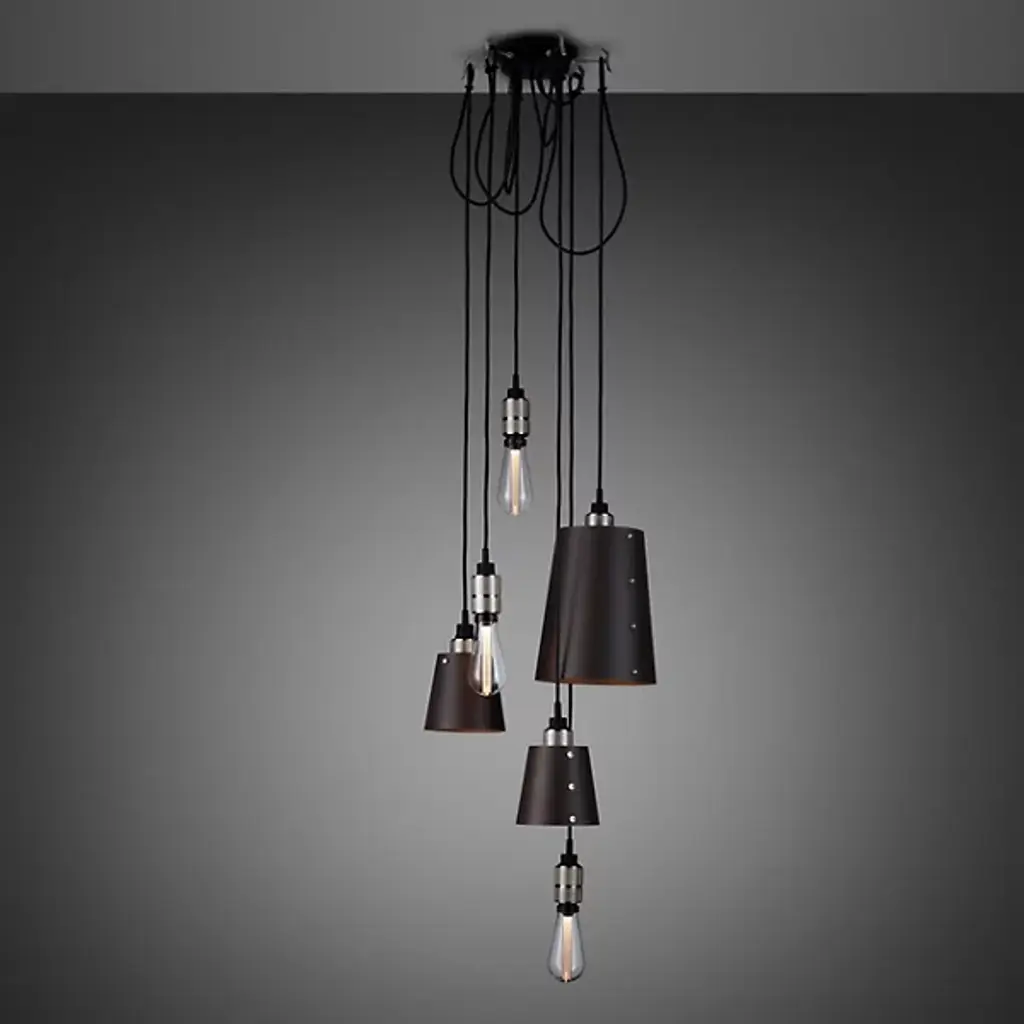 Give a gorgeous enhancement to interiors with the Hooked 6.0 Mix Multi-Light Pendant from Buster + Punch. A mix of simple design elements set in an elegant array, it blooms down from a circular canopy studded with solid metal hooks that reach out evenly in all directions, each hook retaining a single woven cord that loops around it at any desired height and ending in a knurl-accented single socket. The lamping is at once left open and screened by a variety of flared metal shades, maintaining the robust industrial look while creating a cornucopia of ambient light