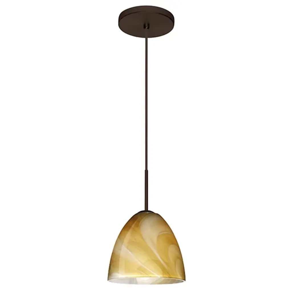 The Hoppi features a wide cone-shaped glass, that demonstrates contemporary sensibilities. Our Mocha/Clear glass is a pressed glass that features a cream color that is marbleized with brown. An arched clear rod acts an accent, beautifully playing with the illumination of the fixture. When lit this gives off a light that is functional and soothing. The smooth satin finish on the clear outer layer is a result of an extensive etching process. This handcrafted glass uses a process where every glass is consistently produced using a press mold, keeping variations to a minimum. The 12V cord pendant fixture is equipped with a 10' braided coaxial cord with Teflon jacket and a low profile flat monopoint canopy. These stylish and functional luminaries are offered in a beautiful Satin Nickel finish.