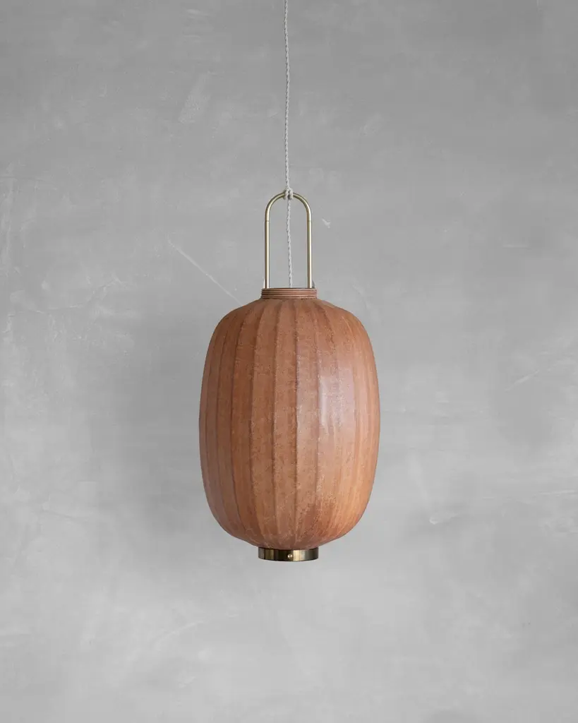HU01M Pendant Lamp XL by Taiwan LanternDimensions: D 65 x W 65 x H 55 cm.Material: Walnut & bamboo frame, Hand-colored fabrics, Metal pipes, Leather lace, Handmade porcelain ceiling cap.This brown color is inspired by Wu Xing 五行. Brown presents Tu 土,earth, which signifies neutrality and good luck. The lantern is hand painted and finished with a layer of Tung oil which gives the lantern a smooth satin finish.Founded in 2013 by Pei-Ching Hsiao, Taiwan-Lantern is an Amsterdam-based studio on a mission to revive Taiwan's rich traditions and century-old craftsmanship. Beyond the common perception of mass production and electronics, our studio cherishes Taiwan's unique heritage, crafting items with stories and memories.We work with Taiwan’s last remaining traditional lantern factory and the finest local artisans. Together we embarked on an adventurous journey to modernize the design, optimize the quality, and return to natural materials.Each lantern involves various crafts, from ceramics, fabric dyeing with plants, painting, traditional knotting, woodworking, metal welding, and bamboo crafts. By combining these diverse traditional crafts, we honor our beloved heritage and advance the evolve the art of lantern making. Each lantern represents Taiwan's rich cultural legacy.We prioritize sustainability, using 95% locally sourced natural materials. Our lantern frames, crafted from walnut wood and locally grown Makino bamboo, connect Taiwan's historical roots with a sustainable future, infusing each lantern with heart and soul.