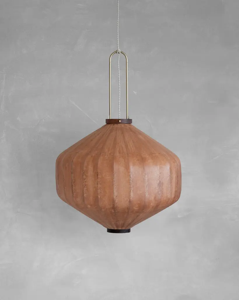 HU01T Pendant Lamp L by Taiwan LanternDimensions: D 57 x W 57 x H 50 cm.Material: Walnut & bamboo frame, Hand-colored fabrics, Metal pipes, Leather lace, Handmade porcelain ceiling cap.This brown color is inspired by Wu Xing 五行. Brown presents Tu 土,earth, which signifies neutrality and good luck. The lantern is hand painted and finished with a layer of Tung oil which gives the lantern a smooth satin finish.Founded in 2013 by Pei-Ching Hsiao, Taiwan-Lantern is an Amsterdam-based studio on a mission to revive Taiwan's rich traditions and century-old craftsmanship. Beyond the common perception of mass production and electronics, our studio cherishes Taiwan's unique heritage, crafting items with stories and memories.We work with Taiwan’s last remaining traditional lantern factory and the finest local artisans. Together we embarked on an adventurous journey to modernize the design, optimize the quality, and return to natural materials.Each lantern involves various crafts, from ceramics, fabric dyeing with plants, painting, traditional knotting, woodworking, metal welding, and bamboo crafts. By combining these diverse traditional crafts, we honor our beloved heritage and advance the evolve the art of lantern making. Each lantern represents Taiwan's rich cultural legacy.We prioritize sustainability, using 95% locally sourced natural materials. Our lantern frames, crafted from walnut wood and locally grown Makino bamboo, connect Taiwan's historical roots with a sustainable future, infusing each lantern with heart and soul.