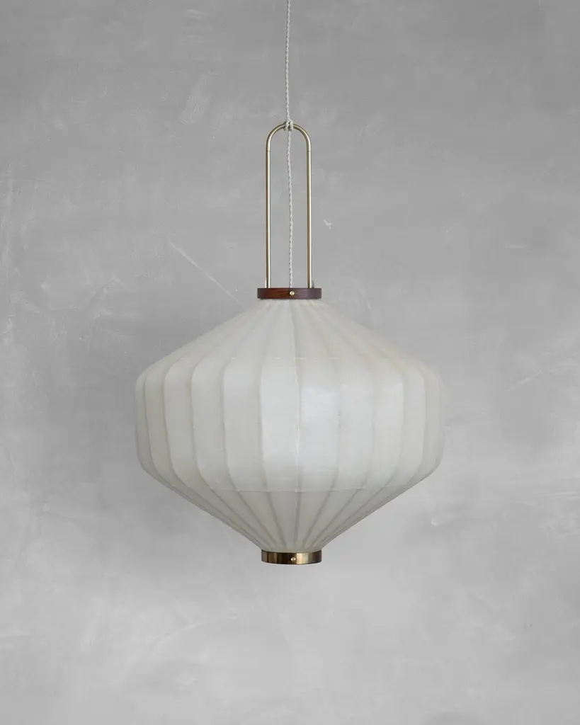 HU02O Pendant Lamp XL by Taiwan LanternDimensions: D 46 x W 46 x H 68 cm.Material: Walnut & bamboo frame, Hand-colored fabrics, Metal pipes, Leather lace, Handmade porcelain ceiling cap.This brown color is inspired by Wu Xing 五行. Brown presents Tu 土,earth, which signifies neutrality and good luck. The lantern is hand painted and finished with a layer of Tung oil which gives the lantern a smooth satin finish.Founded in 2013 by Pei-Ching Hsiao, Taiwan-Lantern is an Amsterdam-based studio on a mission to revive Taiwan's rich traditions and century-old craftsmanship. Beyond the common perception of mass production and electronics, our studio cherishes Taiwan's unique heritage, crafting items with stories and memories.We work with Taiwan’s last remaining traditional lantern factory and the finest local artisans. Together we embarked on an adventurous journey to modernize the design, optimize the quality, and return to natural materials.Each lantern involves various crafts, from ceramics, fabric dyeing with plants, painting, traditional knotting, woodworking, metal welding, and bamboo crafts. By combining these diverse traditional crafts, we honor our beloved heritage and advance the evolve the art of lantern making. Each lantern represents Taiwan's rich cultural legacy.We prioritize sustainability, using 95% locally sourced natural materials. Our lantern frames, crafted from walnut wood and locally grown Makino bamboo, connect Taiwan's historical roots with a sustainable future, infusing each lantern with heart and soul.
