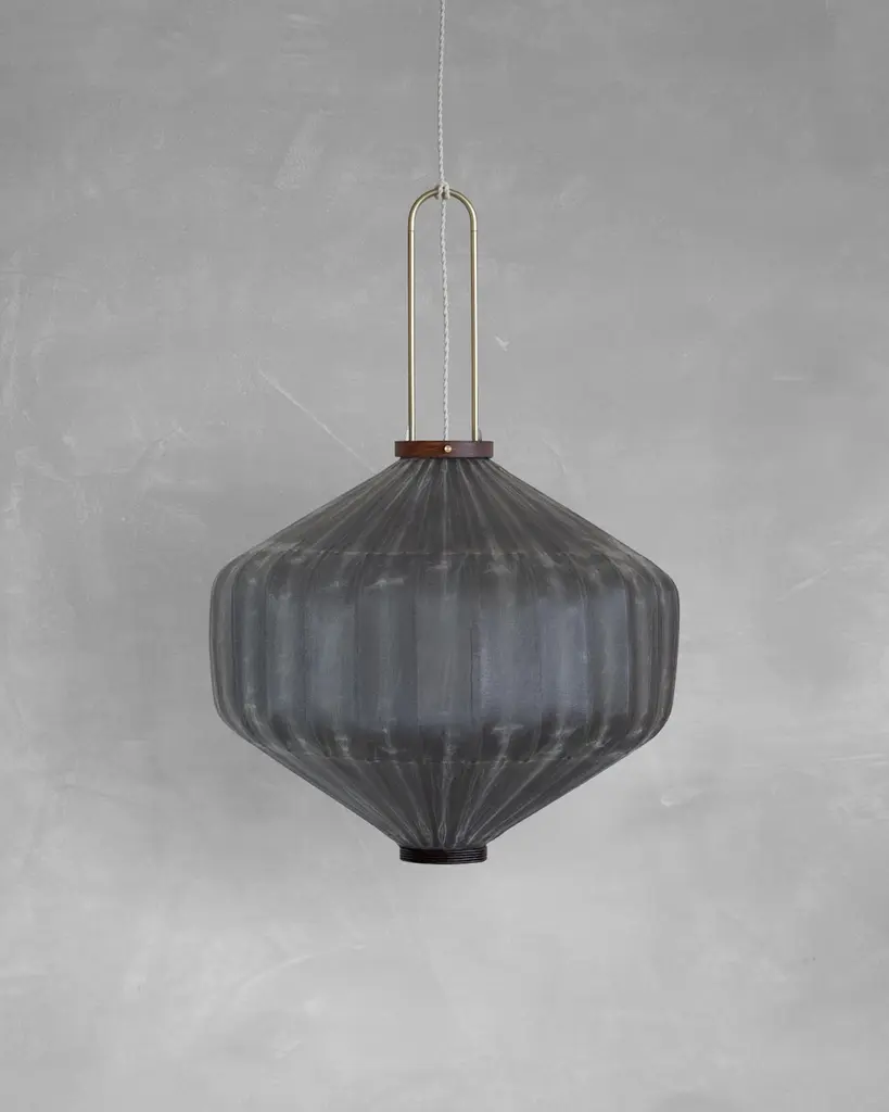 HU03B Pendant Lamp XL by Taiwan LanternDimensions: D 47 x W 47 x H 63 cm.Material: Walnut & bamboo frame, Hand-colored fabrics, Metal pipes, Leather lace, Handmade porcelain ceiling cap.This brown color is inspired by Wu Xing 五行. Brown presents Tu 土,earth, which signifies neutrality and good luck. The lantern is hand painted and finished with a layer of Tung oil which gives the lantern a smooth satin finish.Founded in 2013 by Pei-Ching Hsiao, Taiwan-Lantern is an Amsterdam-based studio on a mission to revive Taiwan's rich traditions and century-old craftsmanship. Beyond the common perception of mass production and electronics, our studio cherishes Taiwan's unique heritage, crafting items with stories and memories.We work with Taiwan’s last remaining traditional lantern factory and the finest local artisans. Together we embarked on an adventurous journey to modernize the design, optimize the quality, and return to natural materials.Each lantern involves various crafts, from ceramics, fabric dyeing with plants, painting, traditional knotting, woodworking, metal welding, and bamboo crafts. By combining these diverse traditional crafts, we honor our beloved heritage and advance the evolve the art of lantern making. Each lantern represents Taiwan's rich cultural legacy.We prioritize sustainability, using 95% locally sourced natural materials. Our lantern frames, crafted from walnut wood and locally grown Makino bamboo, connect Taiwan's historical roots with a sustainable future, infusing each lantern with heart and soul.