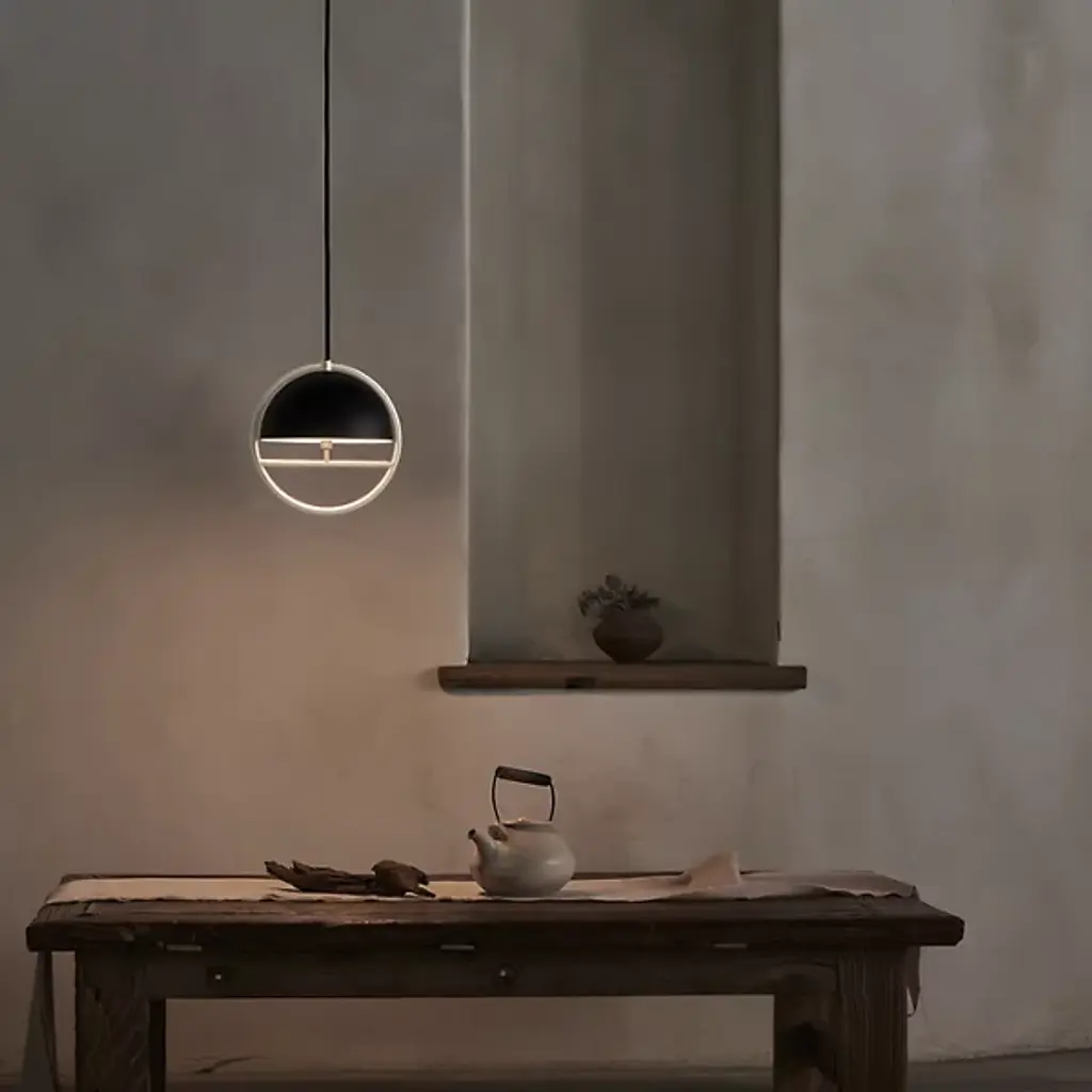Inspired by the tone-setting silhouette of the oriental garden’s moon gate. The Huan Pendant from Seed Design creates a calming atmosphere during the day with its balanced shapes and at night through its diffused light. It hangs gracefully with a slender cord that invites placement as part of a series over a table or on its own. The clean metal frame references the moon gate with a circular outline. This outline stands out thanks to its contrasting finish against the shade. The hemisphere shade shields the eye from side glare and directs light down into a soft pool of illumination.