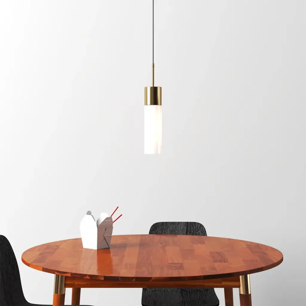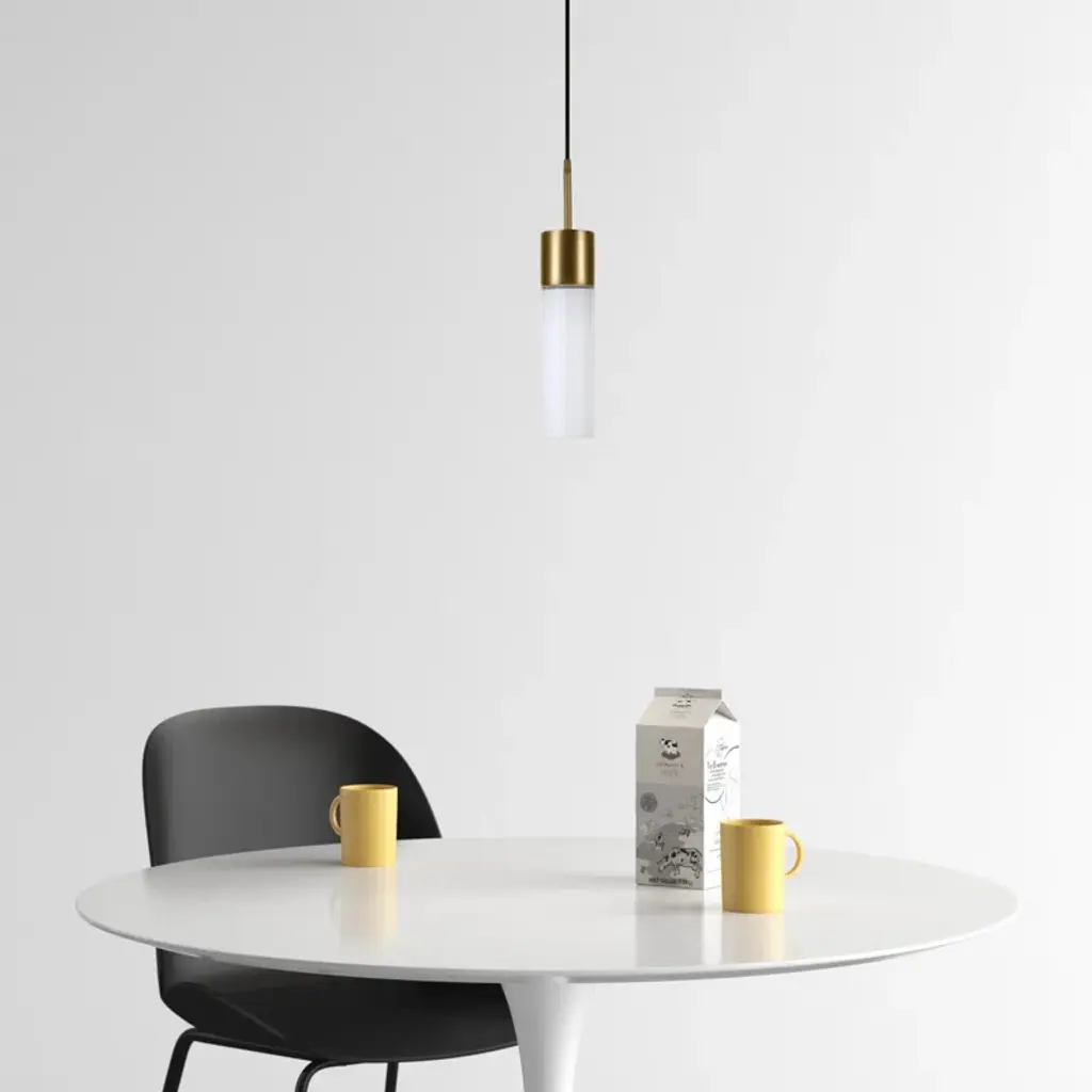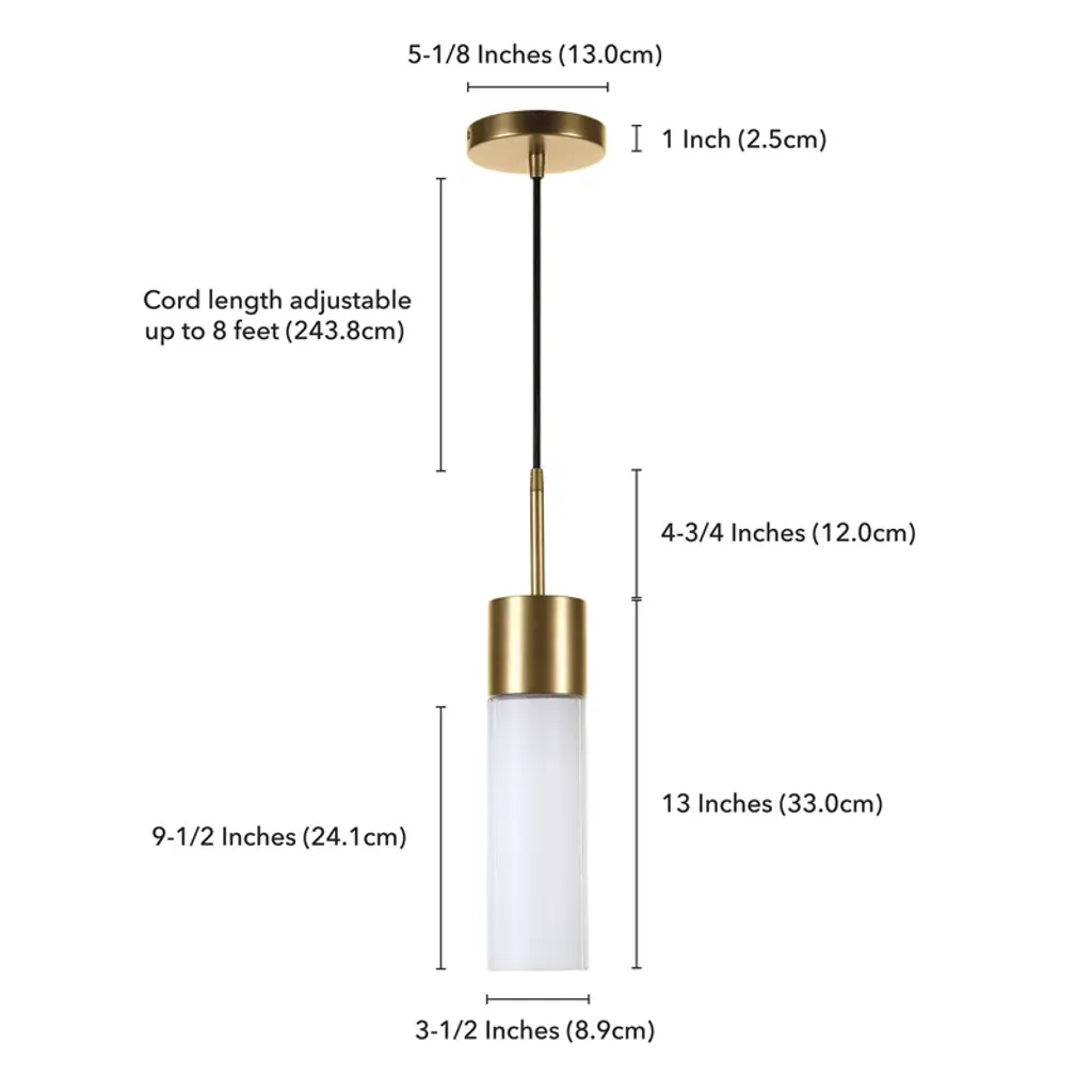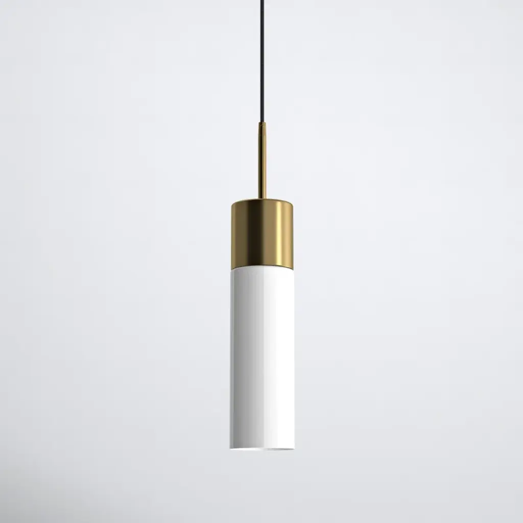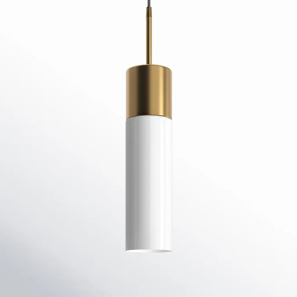 This pendant light draws on factory-style bulbs, but with a bright mid-century twist for an updated look in your space. It hangs from a metal backplate, with a slim metal base in a bright finish. The base supports the cylindrical glass shade, giving the whole piece a pared-down, minimalist look. This pendant accommodates a single 60W bulb (sold separately) to really lean into the industrial vibe, we recommend grabbing a filament bulb. This fixture is compatible with both sloped ceilings and dimmer switches.