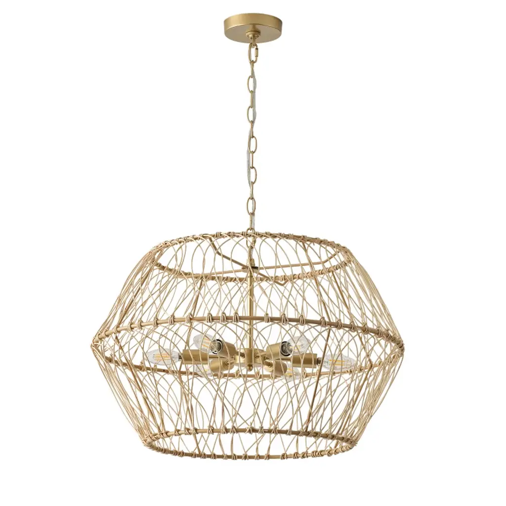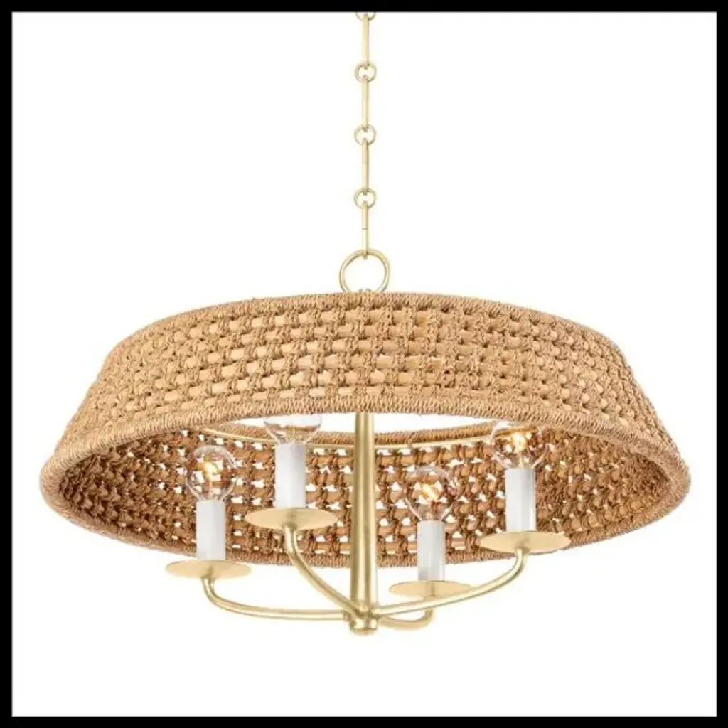 Bradley is a fresh take on tradition. This familiar silhouette is updated with a natural woven shade and paired with vintage gold leaf metalwork, giving the piece texture and warmth making for the perfect centerpiece over a breakfast nook.Features:Dimensions:Electrical Specifications: