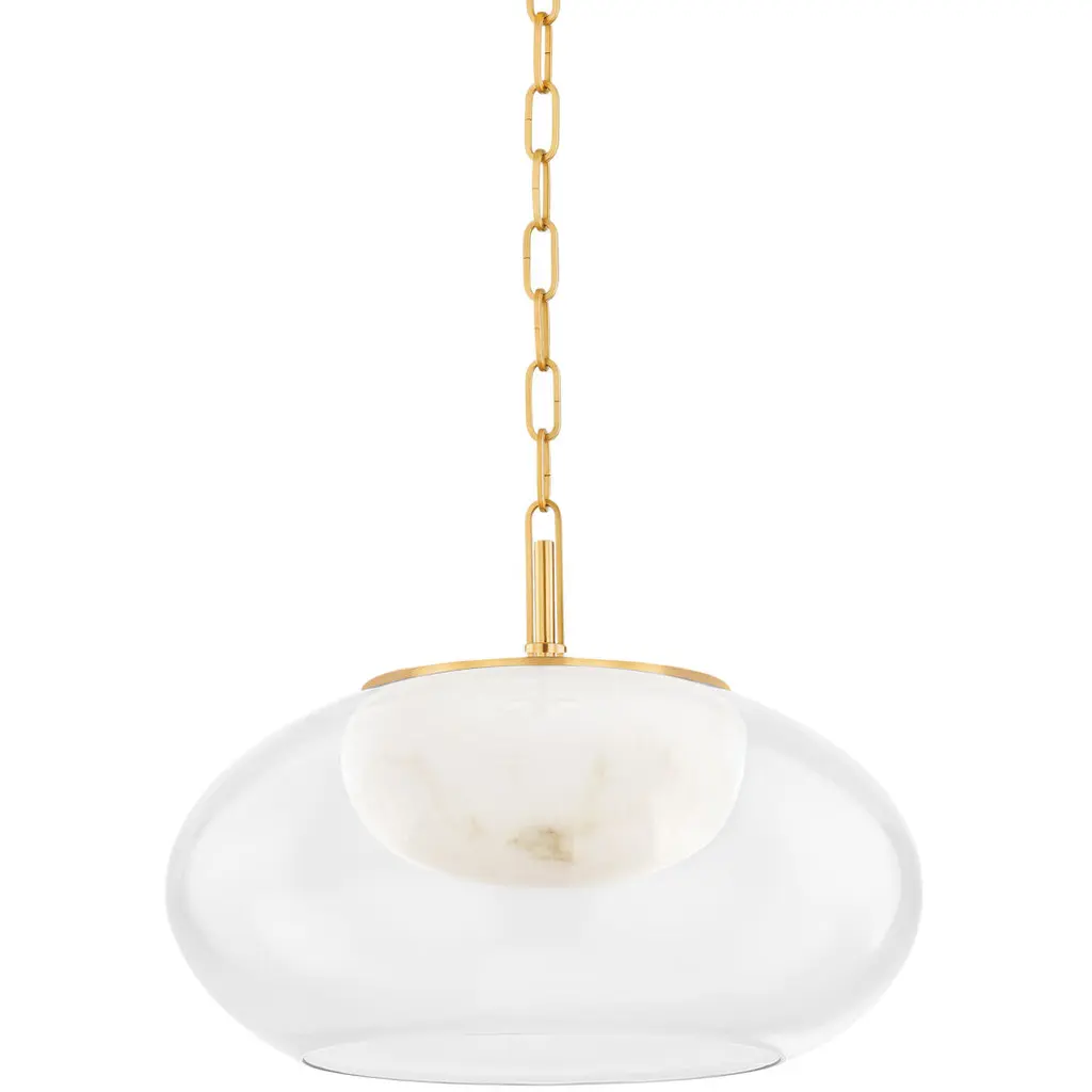 Moore stuns in its simplicity. Available in two sizes, this nested flush mount design features an outer clear glass shade that reveals alabaster within. The double layer gives the fixture an elevated, graceful presence that creates a warm diffusion of light. The metalwork of Moore adds a timeless, luxurious note that complements any design style. *Due to the one-of-a-kind nature of the medium, exact colors and patterns may vary slightly from the image shown.Features:Dimensions:Electrical Specifications: