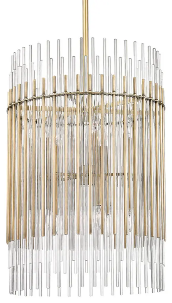 Ten Light Pendant from Wallis collection in Aged Brass finish. Number of Bulbs 10. Max Wattage 60.00. No bulbs included. From the side or from underneath, Wallis presents an interesting perspective. By layering glass and metal rods at staggered but even lengths in a classic drum shape, Wallis manages to feel both contemporary and familiar. At the same time, it directs light vertically and diffuses it horizontally. No UL Availability at this time.
