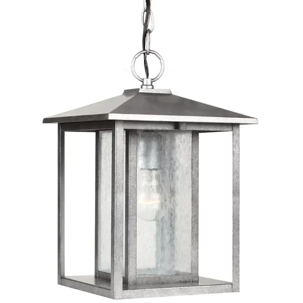The Hunnington Outdoor Pendant with Clear Seeded Glass by Generation Lighting, formerly known as Sea Gull Lighting, features a minimalist style mixed with elements of the traditional. This hanging fixture utilizes a single incandescent or halogen bulb that radiates through beautiful seeded glass, and a timeless lantern shade that suspends from a classic chain. A lovely lighting statement that enhances the appearance of any home entrance with clean, crisp lines.