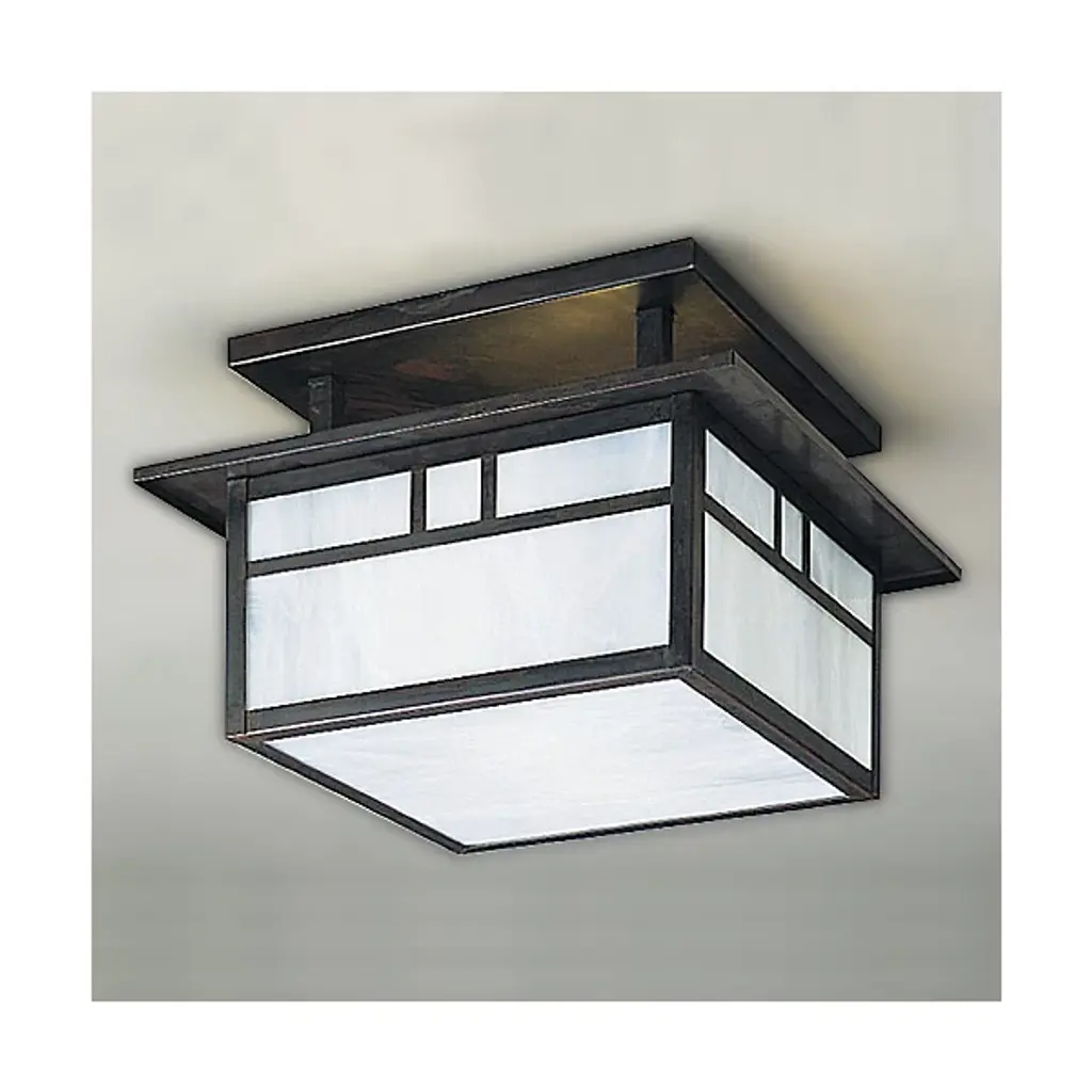 The Huntington 12 in. Semi-Flushmount provides general ambient light. Inspired by early Prairie School designs of Frank Lloyd Wright, this fixture features long horizontal lines and a broad sheltering roof. The close-to-ceiling mount casts reflective light through its open roof design.