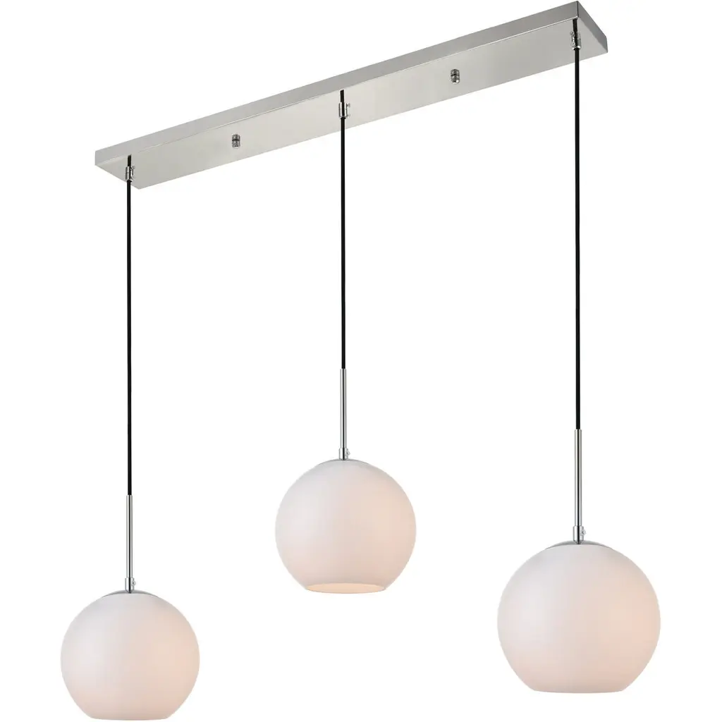 Refined style with a practical design, Huntington hanging pendant lamps bring cosmopolitan sophistication anywhere, especially to an entryway, office, bathroom, bedroom, or kitchen. The smooth iron frame features a rectangular canopy and comes in a chrome finish. Adjustable black cords allow you to vary the hanging height from 14 to 87 inches. A row of three identical frosted white spherical glass shades remain open at the center to allow for effortless replacement of the filament-style bulbs (not included). Living in the big city has never been this easy.