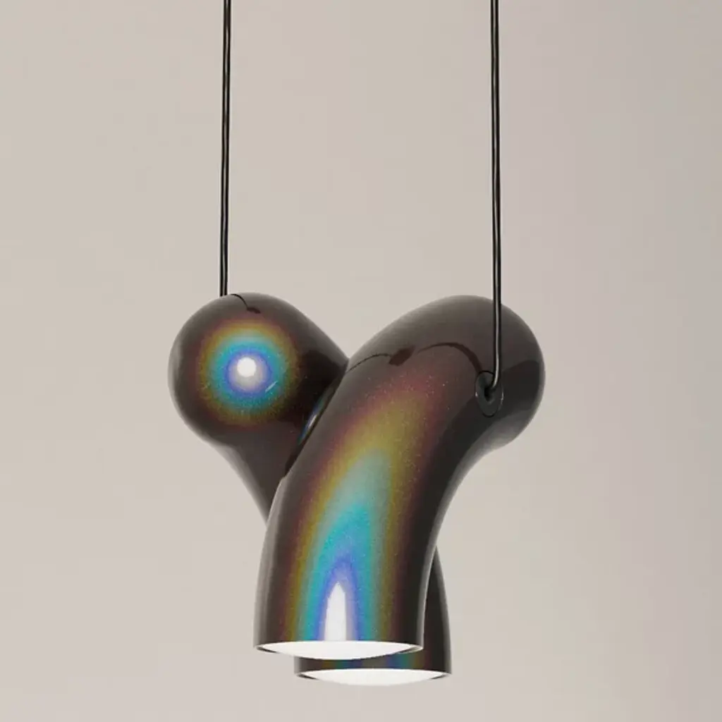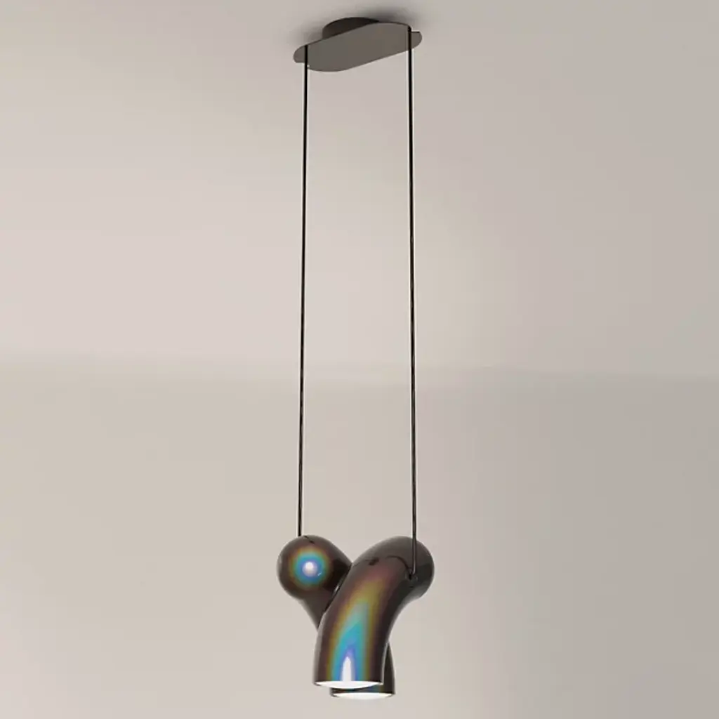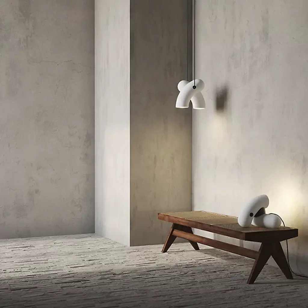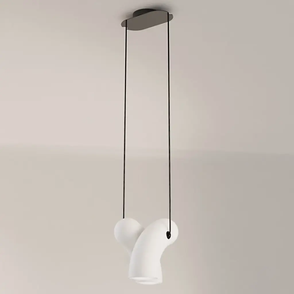 Opposites attract in the aptly named and artfully composed Hyphen LED Pendant from d'Armes. Designer Darmes brings a poetic approach to design that achieves sculptural pieces with contrasting elements. This piece appears to defy gravity as a pair of fine cords drops down as a suspension. They hold intriguing organic forms that delight in their rounded qualities. These unified shapes evoke the linear mark of the hyphen. They rotate on their axis for impressive new silhouettes and light. This LED light diffuses through a lens to create a 2-part dynamic glow with soft qualities.