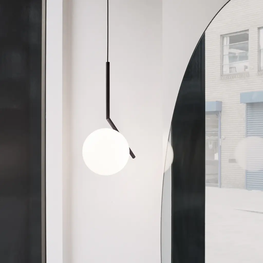 Featuring sleek lines and a contrasting shade, the IC Lights Pendant from FLOS brings contemporary style to your living or dining spaces. Originally designed in 2014 by Michael Anastassiades, this pendant light features a metal frame with an blown opal glass diffuser for warm, glowing light. Suspend across a kitchen island to bring ample light to mealtime or flank either side of a master bed to bring a unique lighting source to your master bedroom. Highlights