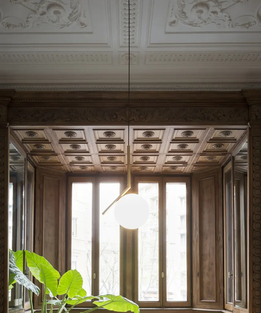 Like the other pieces in the IC Light Series, the IC Lights S balances designer Michael Anastassiades' love of industrial simplicity with intricate symbolism. Providing diffused light through an opal-blown glass diffuser, this pendant light is framed in brass-finished steel. The inspiration behind the design: Poise is powerful: That's the message Michael Anastassiades offers with his IC Light Series. From the skillful balance of the sphere and baton that invokes thoughts of a dexterous juggler's act to the lamp's name-IC, a reference to the identity code used to evaluate immigrants entering the UK-the designer makes a commanding statement. This authentic design is produced in Italy exclusively by Flos.