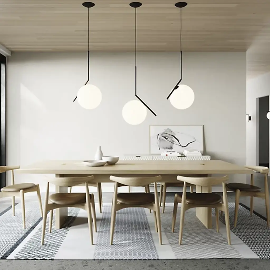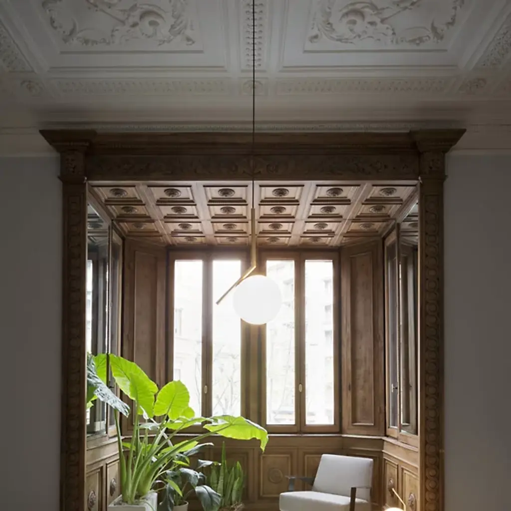 The IC S Pendant Light from FLOS is a case study in balance. After watching a video clip of a contact juggler, designer Michael Anastassiades was inspired by the skill it took to spin and move the set of spheres around the juggler's body. His starting point was to capture the moment where the spheres seemed to freeze in place on the juggler's arms and edge of his fingers, thus was born the IC collection. Features a steel frame and blown glass opal diffuser.