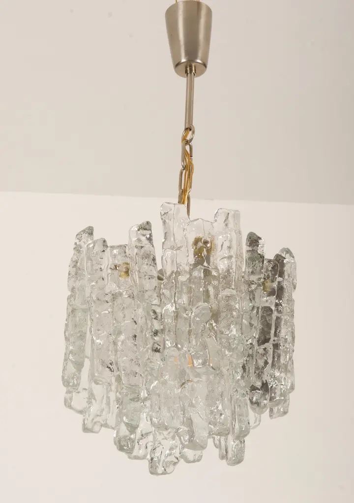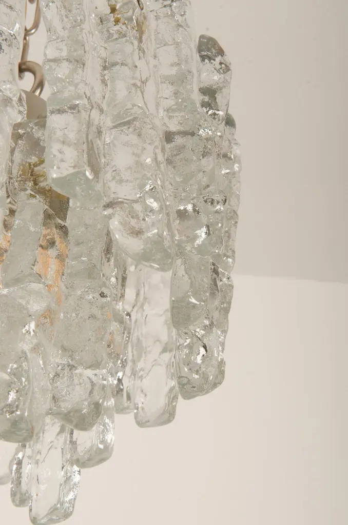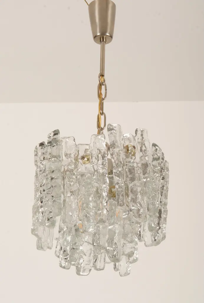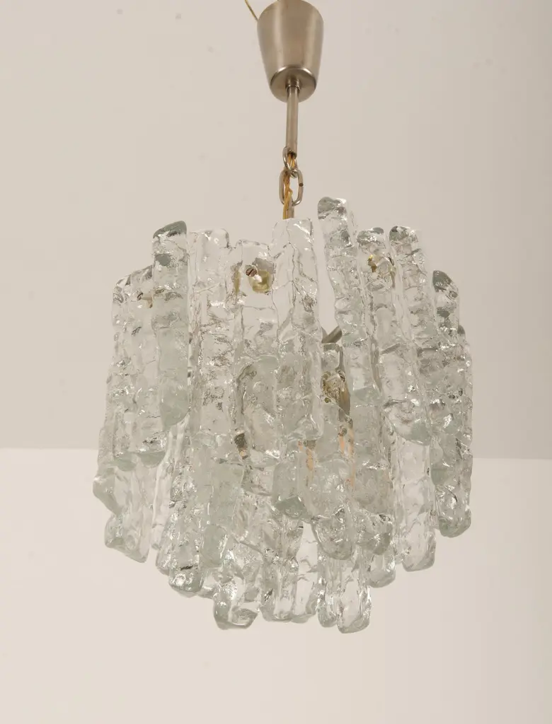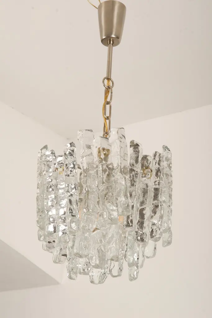 Brass frame nickel-plated with 12 ice glass panels, fitted with one E27 socket, made by J.T. Kalmar in the 1960s.