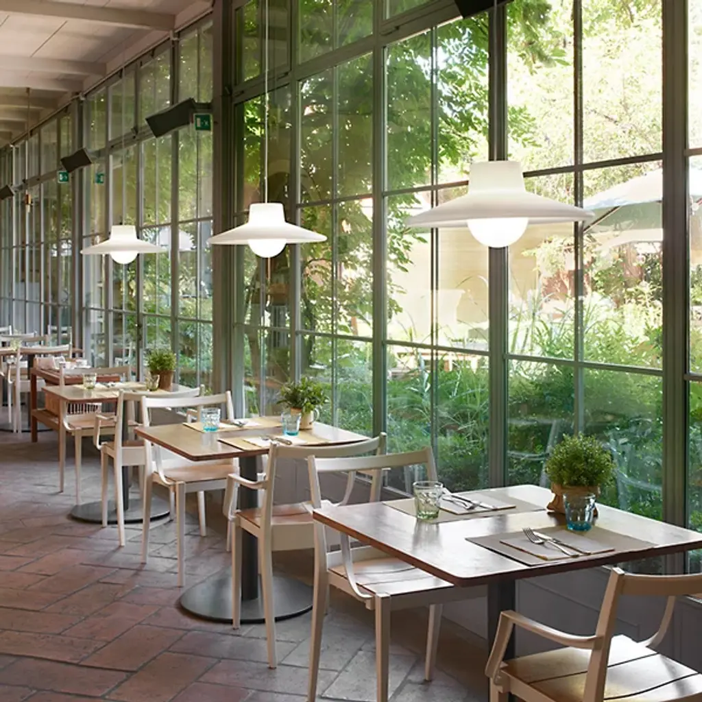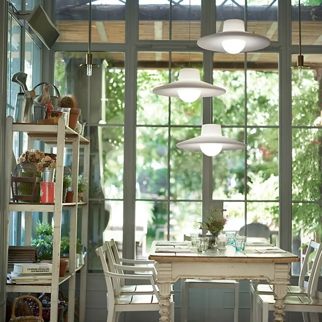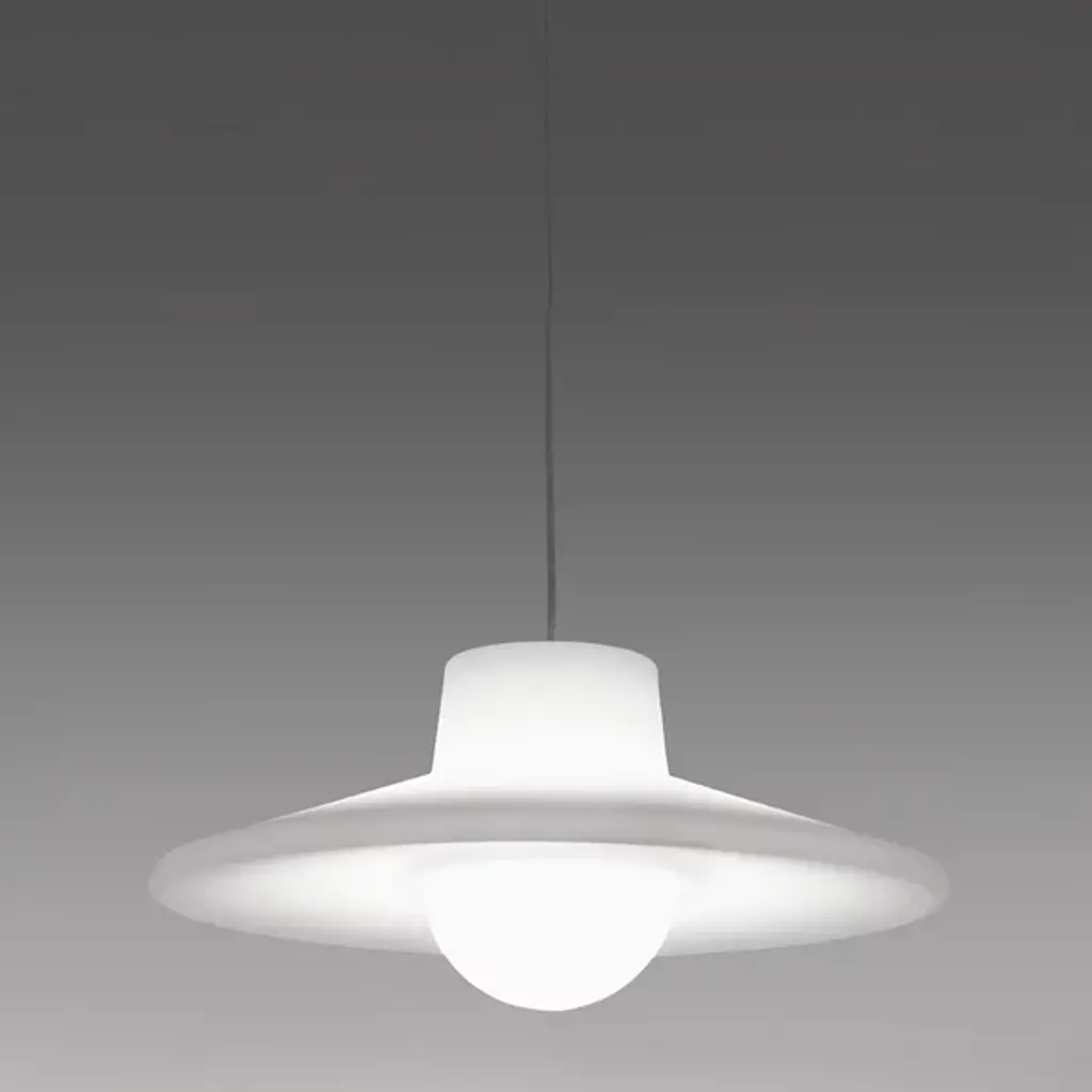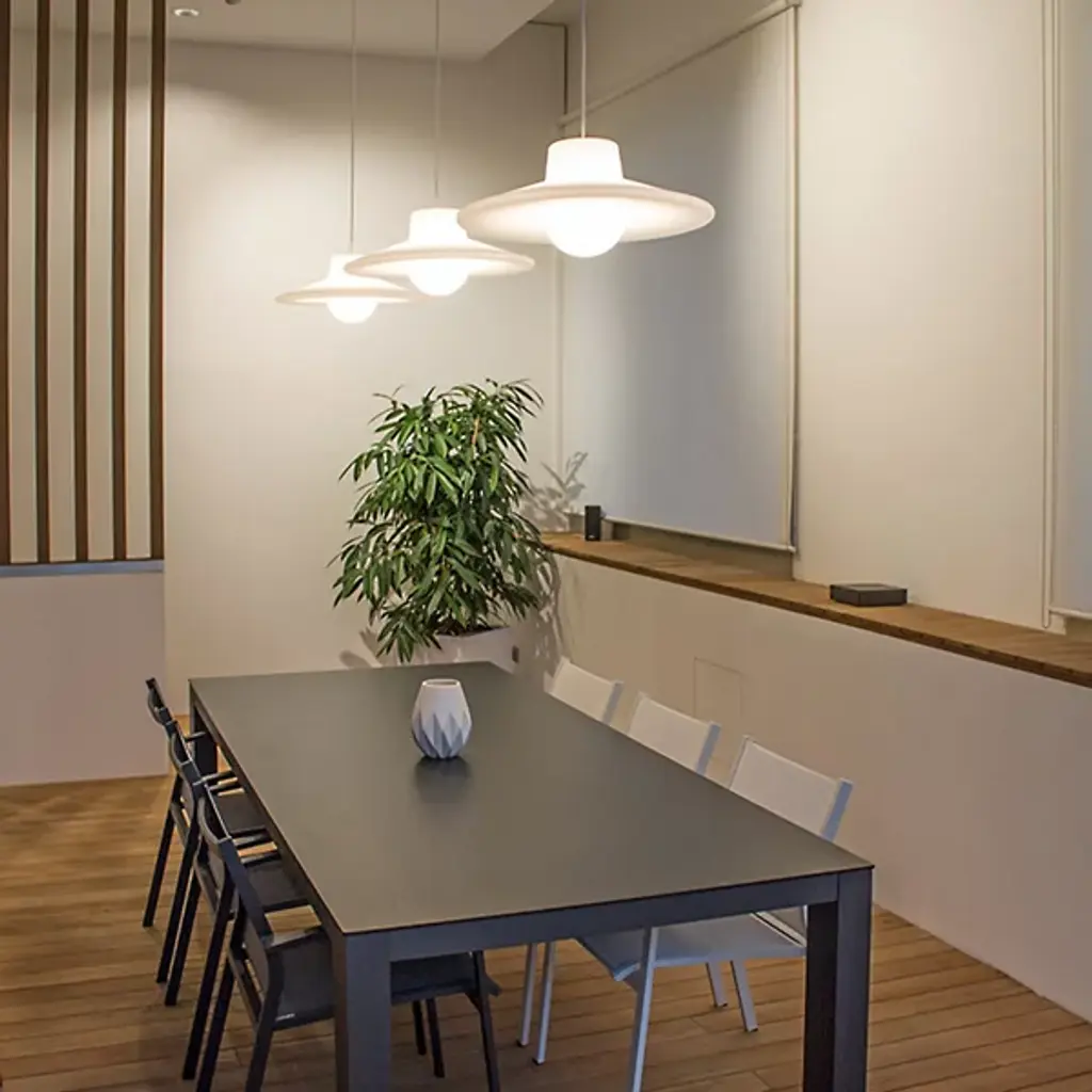 The ICO Pendant from Slide refines the familiar kitchen and dining space luminaire with an inventive material and playful silhouette. Creator Studio Pang's work seeks out the playful and ironic. A slender cord suspension gives the pendant a gravity-defying character. The crisp angles and flaring shape of the hanging shade remind one of the classic luminaires. This polyethylene shade sets itself apart from traditional shades as an opaque form that filters light. Sharing the same material, the globe nestled inside helps make the piece glare-free. Every opaque shape receives a clean glow as an ambient downlight filters out.