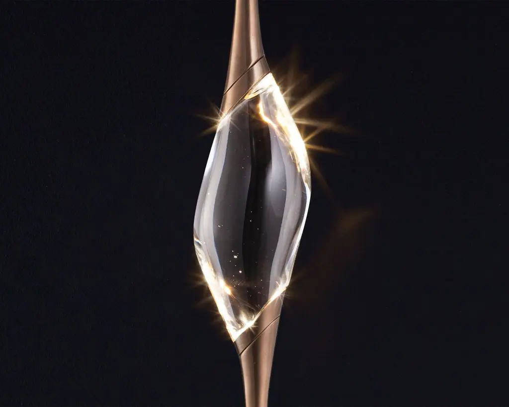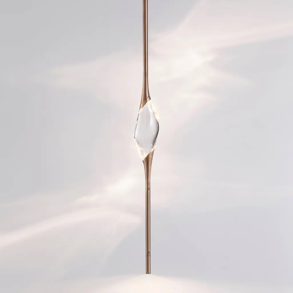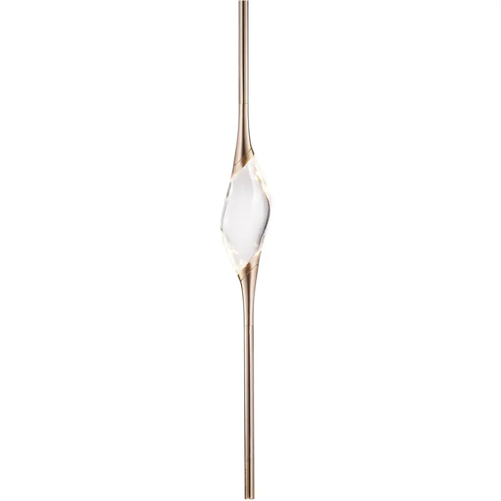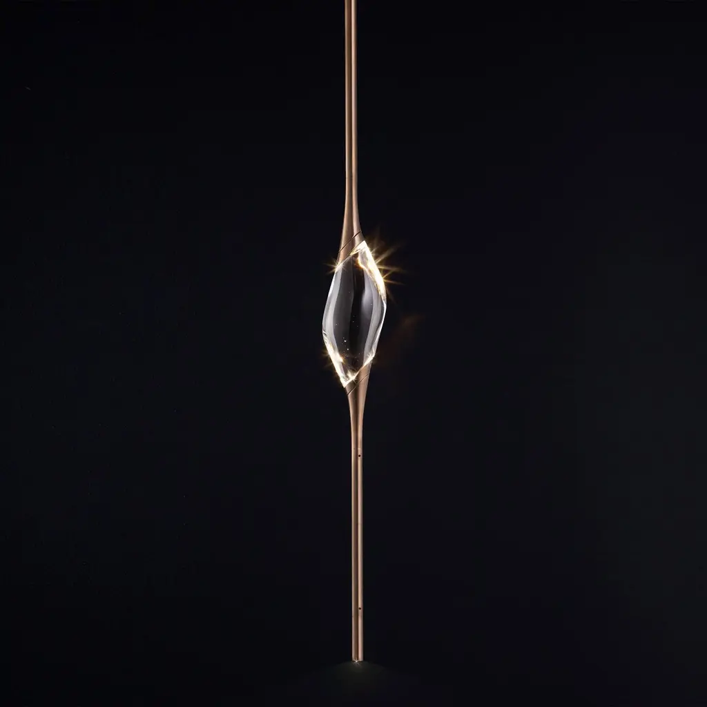 Il Pezzo 12 is a female figure suspended in the air, carrying in her womb the light. It’s nimble, refined, addictive. The solid crystal, illuminated by LEDs, creates suggestive refractions and it’s suspended between brass stems finished in contrasting colors. Each lamp is numbered and hides its own identity stamp that seals and guarantees the authenticity and uniqueness.Structure: BrassFinish: BronzeDiffusers: Solid crystalLight source: 2.700K LED, CRI>90, dimmable.Size: ø10 cm x H 120 cm - ø3.9" x H 47.2" (custom height on request)ETL certified UL and CSA standards compliant.