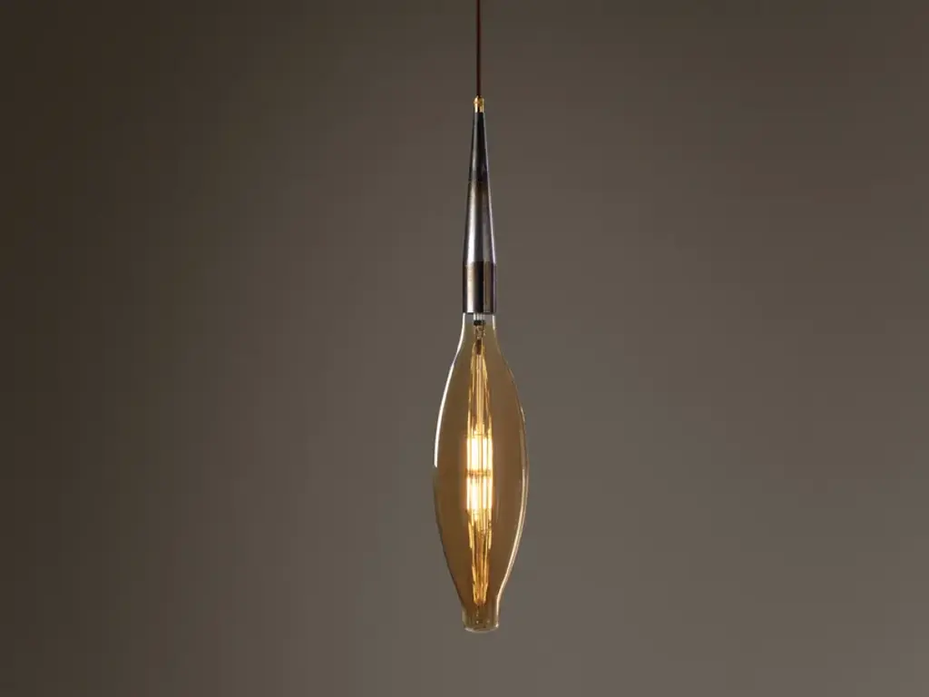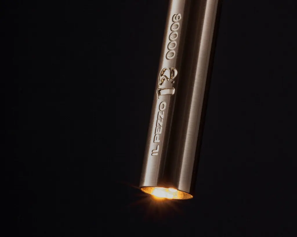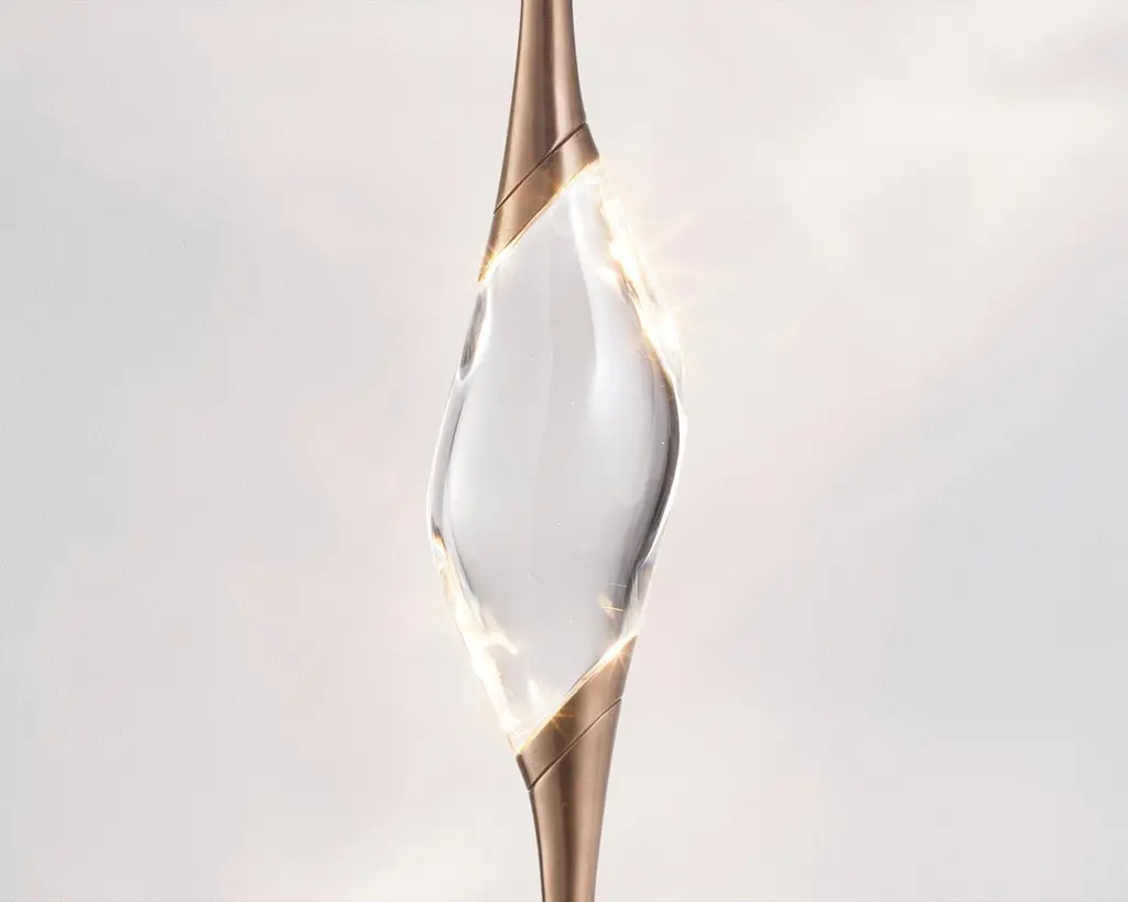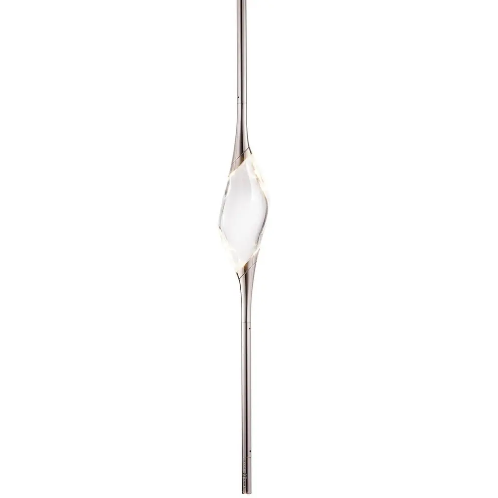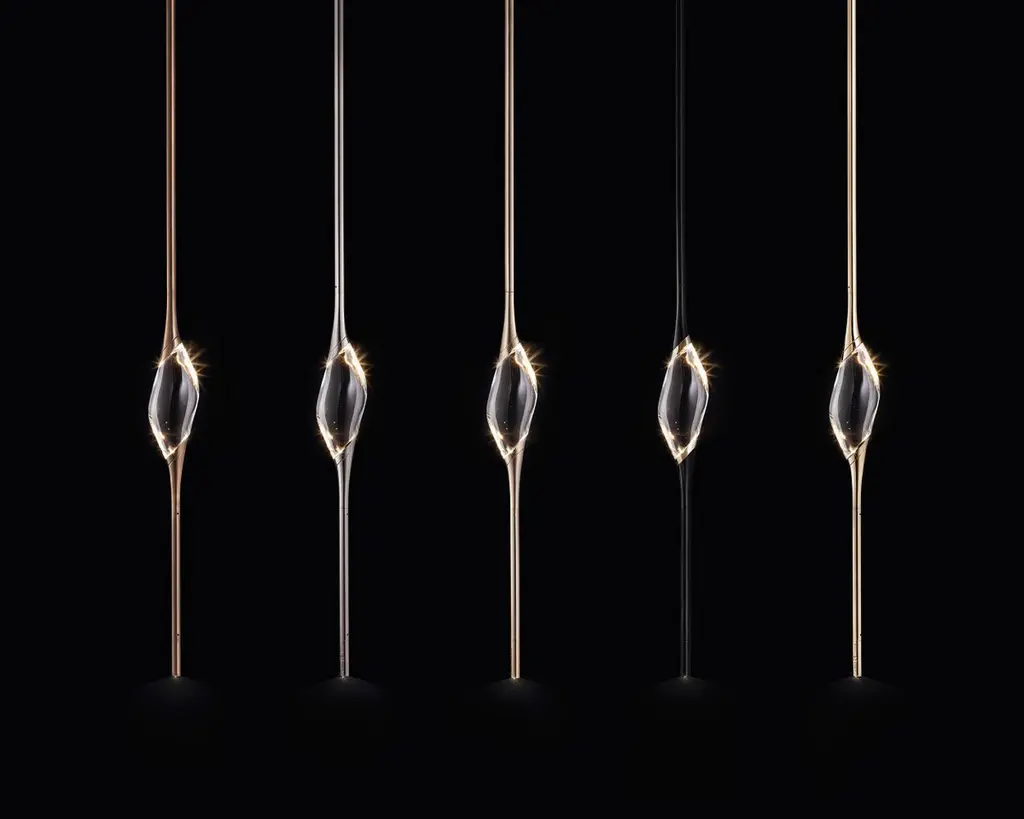 Il Pezzo 12 is a female figure suspended in the air, carrying in her womb the light. It’s nimble, refined, addictive. The solid crystal, illuminated by LEDs, creates suggestive refractions and it’s suspended between brass stems finished in contrasting colors. Each lamp is numbered and hides its own identity stamp that seals and guarantees the authenticity and uniqueness.Structure: BrassFinish: BronzeDiffusers: Solid crystalLight source: 2.700K LED, CRI>90, dimmable.Size: ø10 cm x H 120 cm - ø3.9" x H 47.2" (custom height on request)ETL certified UL and CSA standards compliant.