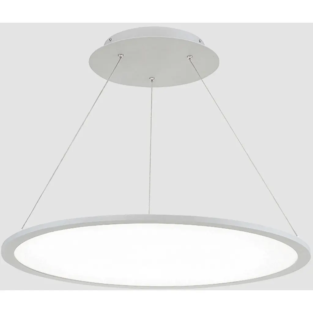 A spectacular halo of direct and indirect light from an incredibly ultra thin 1/2" edge-lit form factor. Three sleek low-profile suspension cables provide power without the need for an additional power cord suspended from the canopy, lending to a simple and minimalistic design for any modern or contemporary home or business. Illusion is adjustable to lengths of 100" through a push-pin locking mechanism at the canopy.