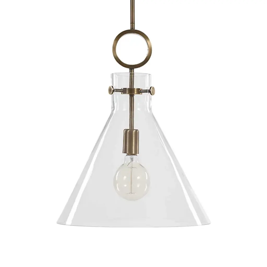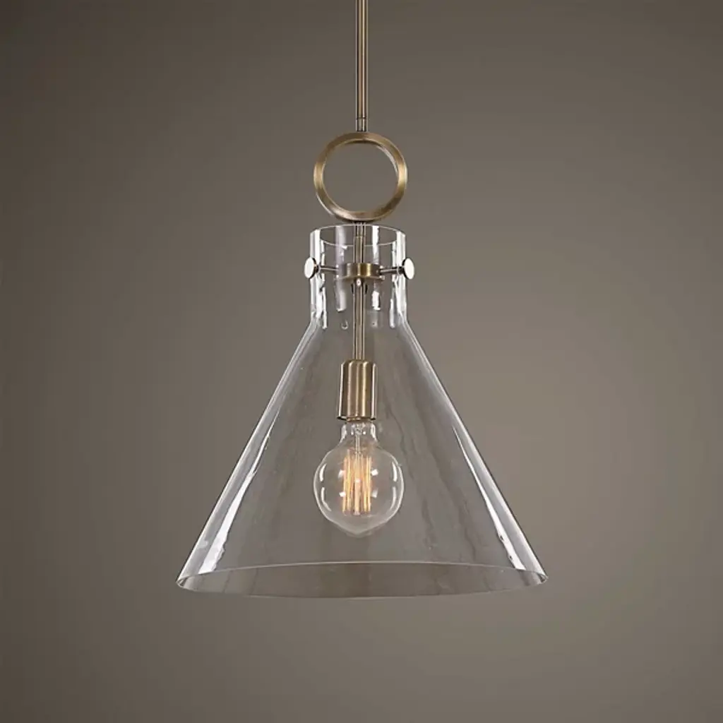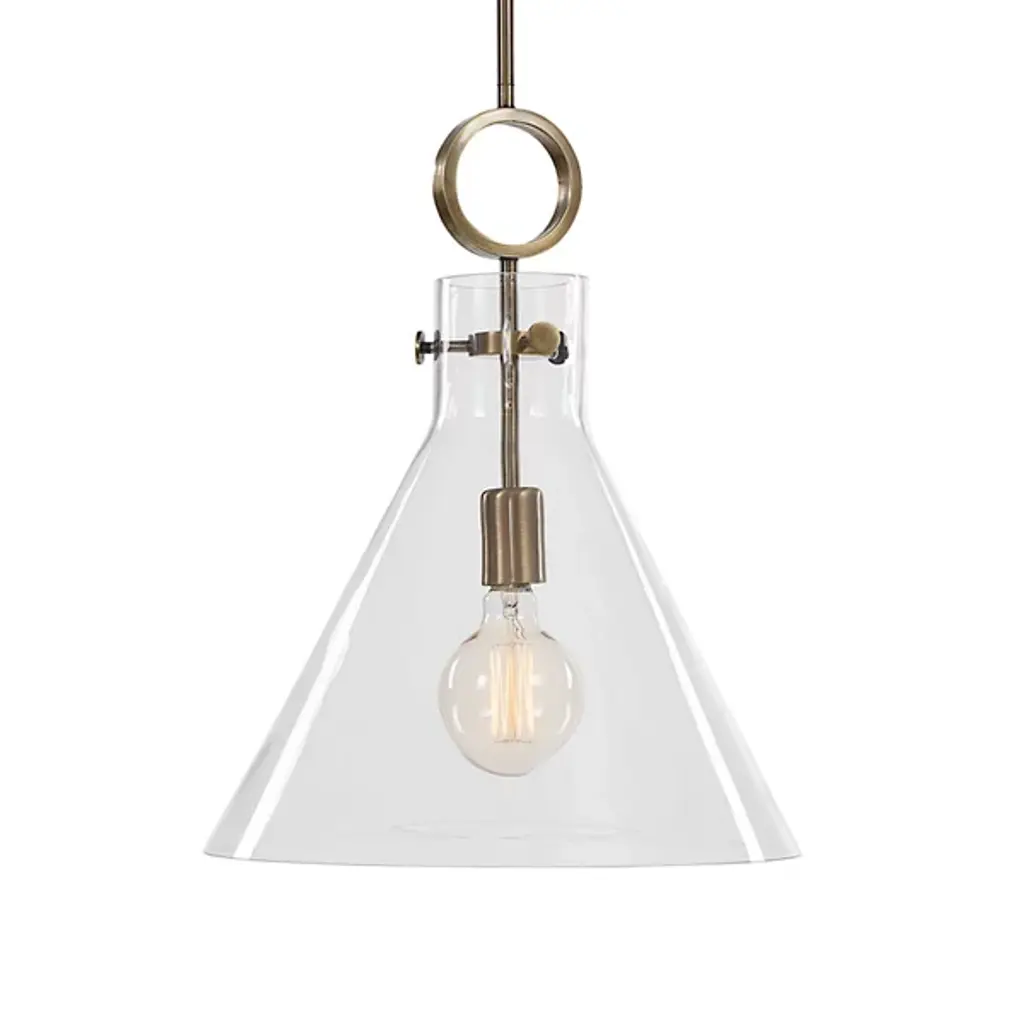 The Imbuto Pendant by Uttermost has a clean, contemporary design that brings a bright touch to its surroundings. Simply suspended by a single down rod and decorative, open loop, this piece supports a visible light source within a clear, flared glass shade. A beautiful finish dresses up the metal elements, lending this design a tailored touch as it offers plenty of illumination to its environment thanks to the crisp glass shade that defines its look.