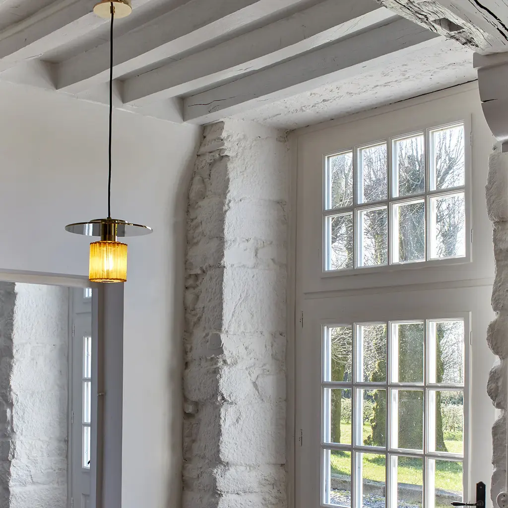 With regal tones of silver and gold, the pendant version of In The Sun features a stylized metal disk atop a glowing mesh diffuser. As part of a renovation at France's palace of Versailles, architect-designers Dominique Perrault and Gaëlle Lauriot-Prévost named their light for Louis XIV, also known as the Sun King. Available in 3 sizes and in either matched or contrasting metallic hues, the luminaire radiates a warm atmosphere with softly cast shadows.