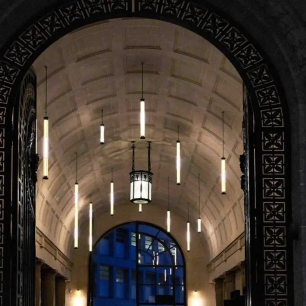 Designer Dominique Perrault domesticates gauzy industrial metal mesh for his glass pendant light that resembles message tubes from the old mail system of Paris. Along with fellow creative Gaëlle Lauriot-Prévost, they have devised In The Tube, a cylinder-shaped fixture made of strong borosilicate, offered in both vertical and horizontal models. With an integrated LED partially wrapped by a removable gold mesh screen (gold or silver offered in Large), it glows with an aura of soft, filtered illumination.