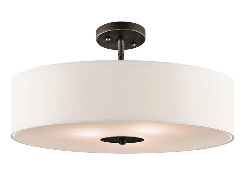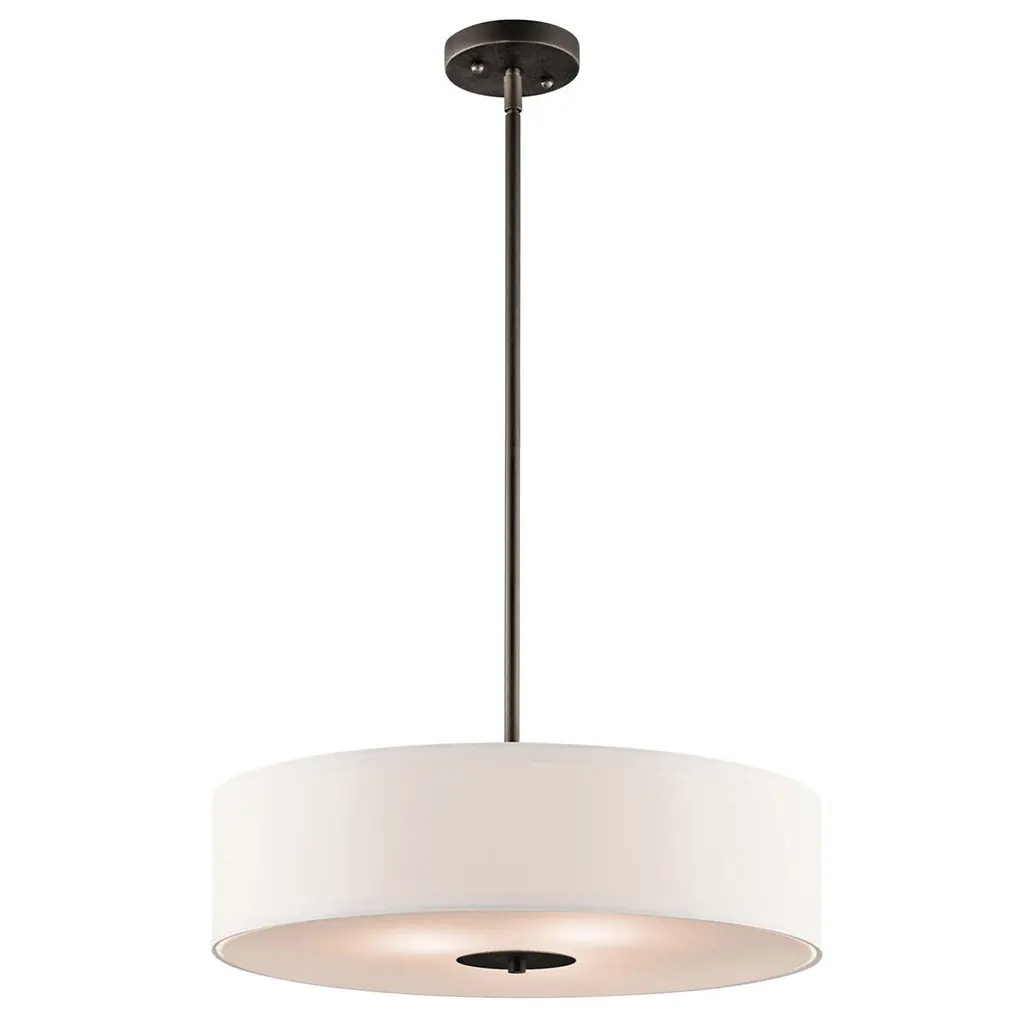 The clean lines and simple styling make this versatile 3 light semi flush ceiling fixture or pendant distinctive. Featuring a classic, Olde Bronze finish, a White Microfiber shade and a Satin Etched Glass diffuser, this design can complement any space.