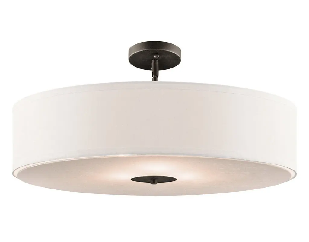 The clean lines and simple styling make this versatile 3 light semi flush ceiling fixture or pendant distinctive. Featuring a classic, Olde Bronze finish, a White Microfiber shade and a Satin Etched Tempered Glass diffuser, this design can complement any space.