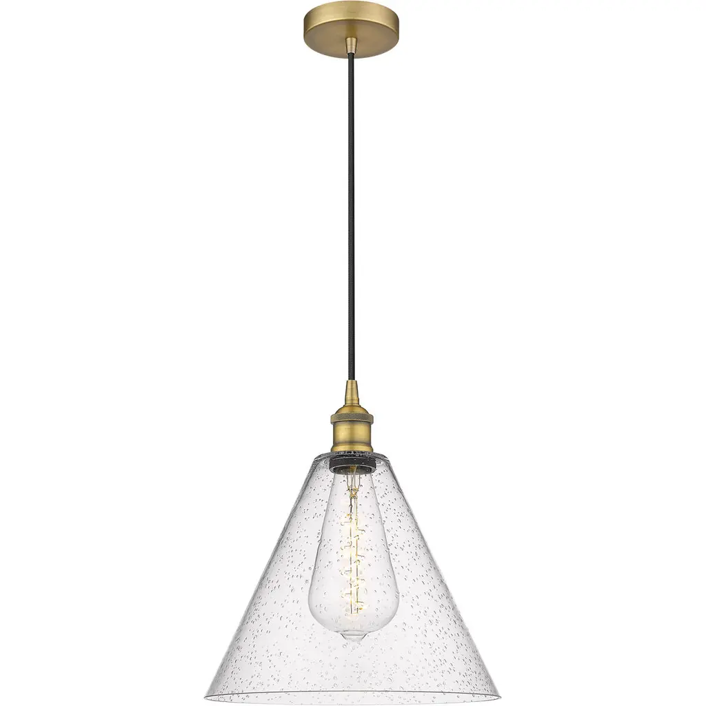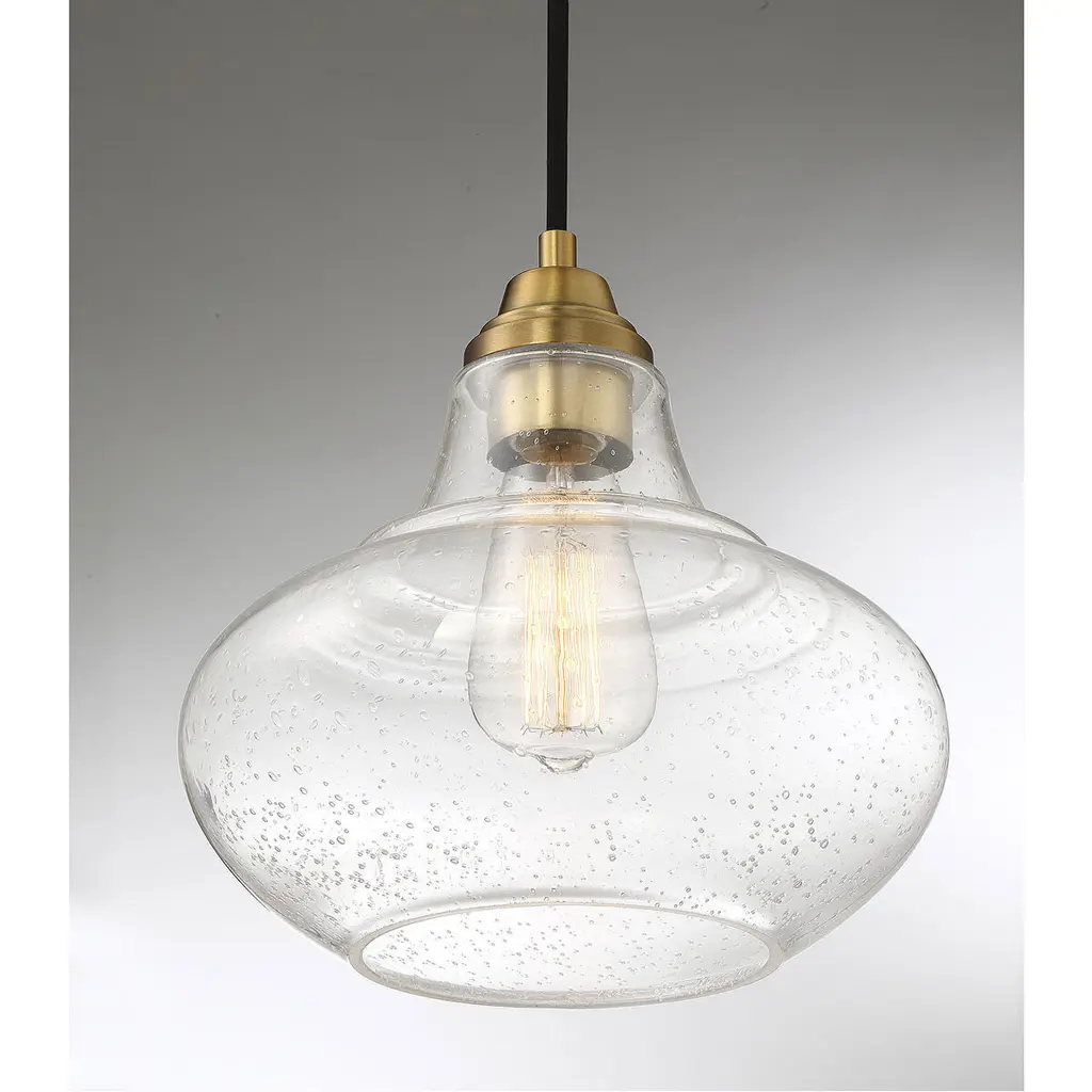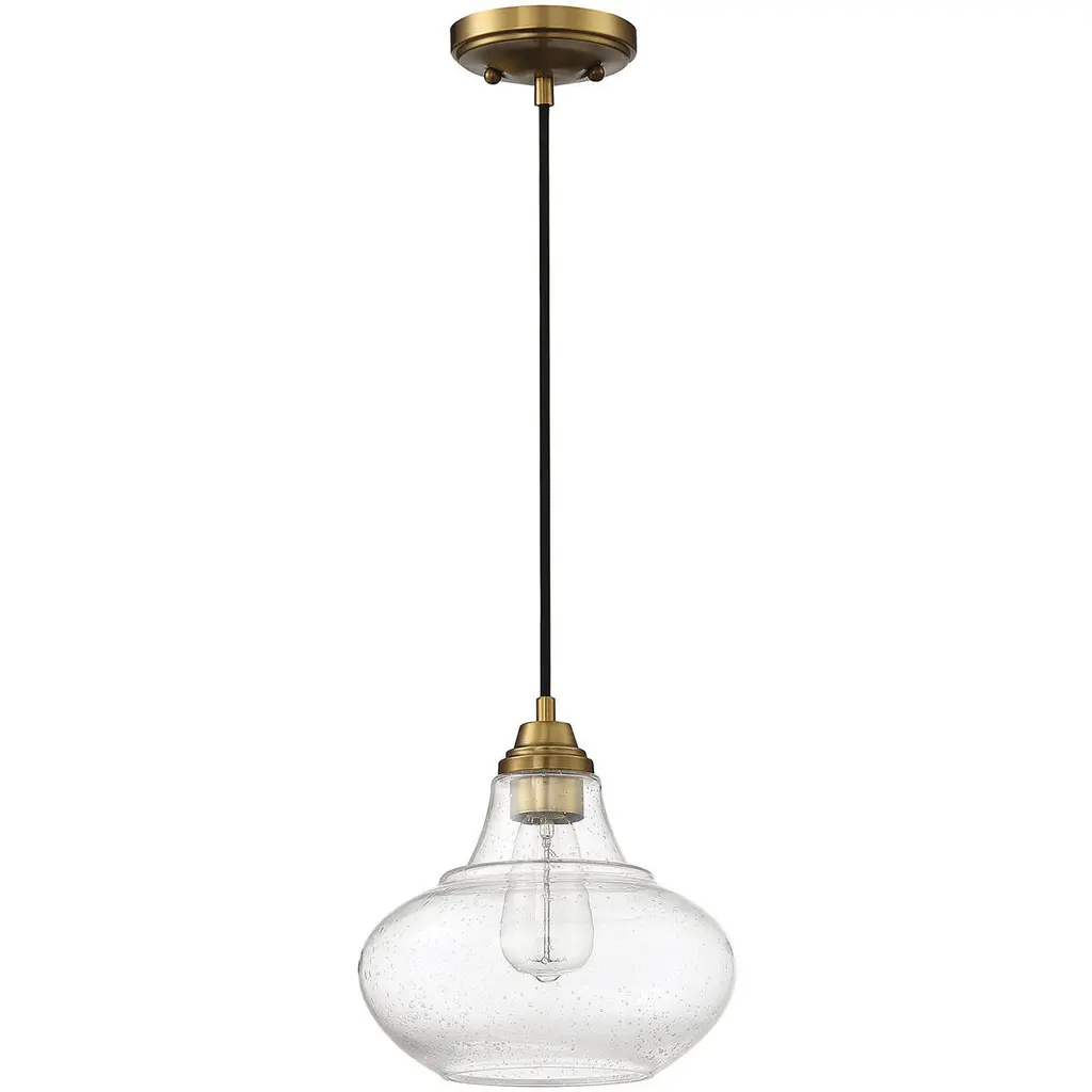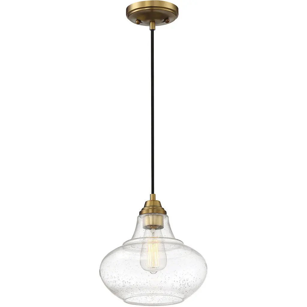Two-tone appeal is easy to get with this 1-light mini pendant. Showcasing a schoolhouse-inspired shade of clear seeded glass, natural brass finished hardware and black cord, it adds a touch of industrial flair to any space. Use this pendant alone or in groups for a huge style impact It is 10" in height and 10" in width, plus it comes with 120" of cord to let you adjust the hanging height as needed. It uses 1 standard size bulb of up to 60 watts, is LED compatible and is dimmable.