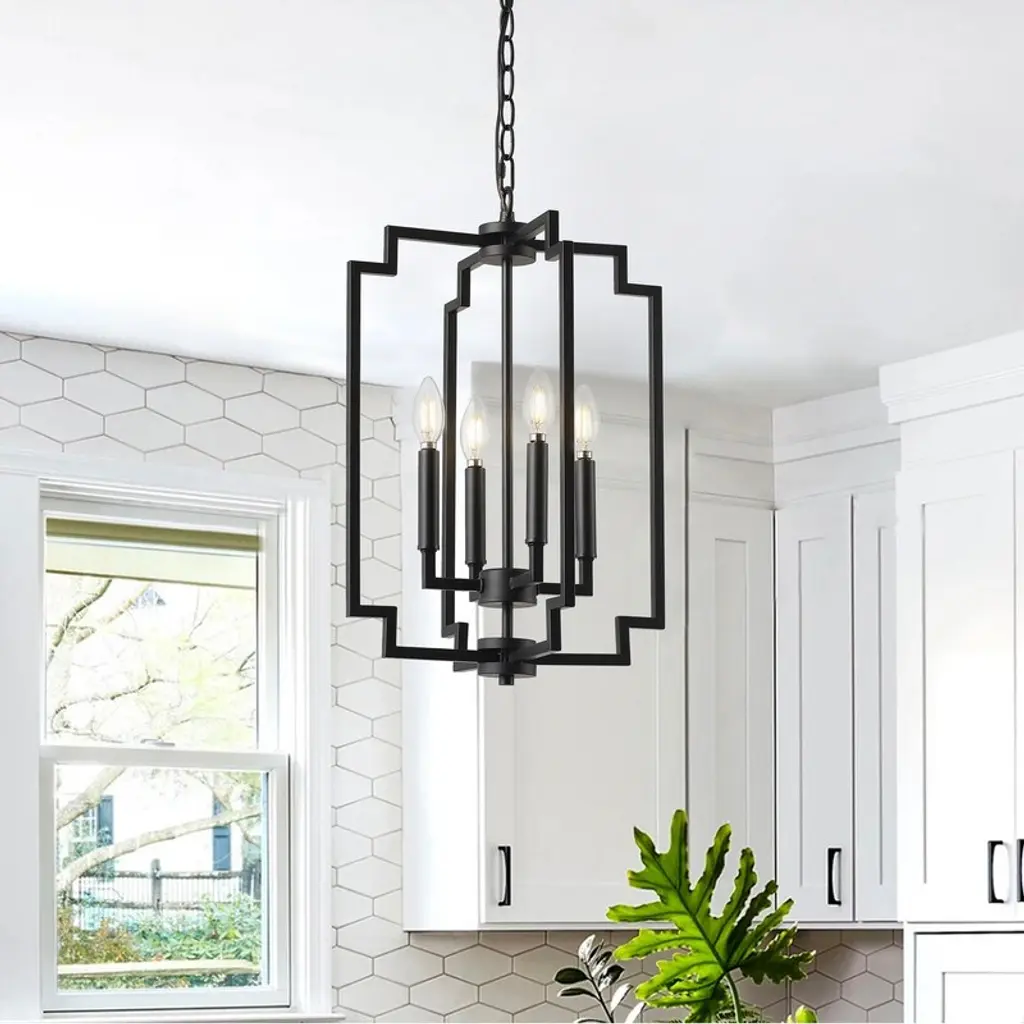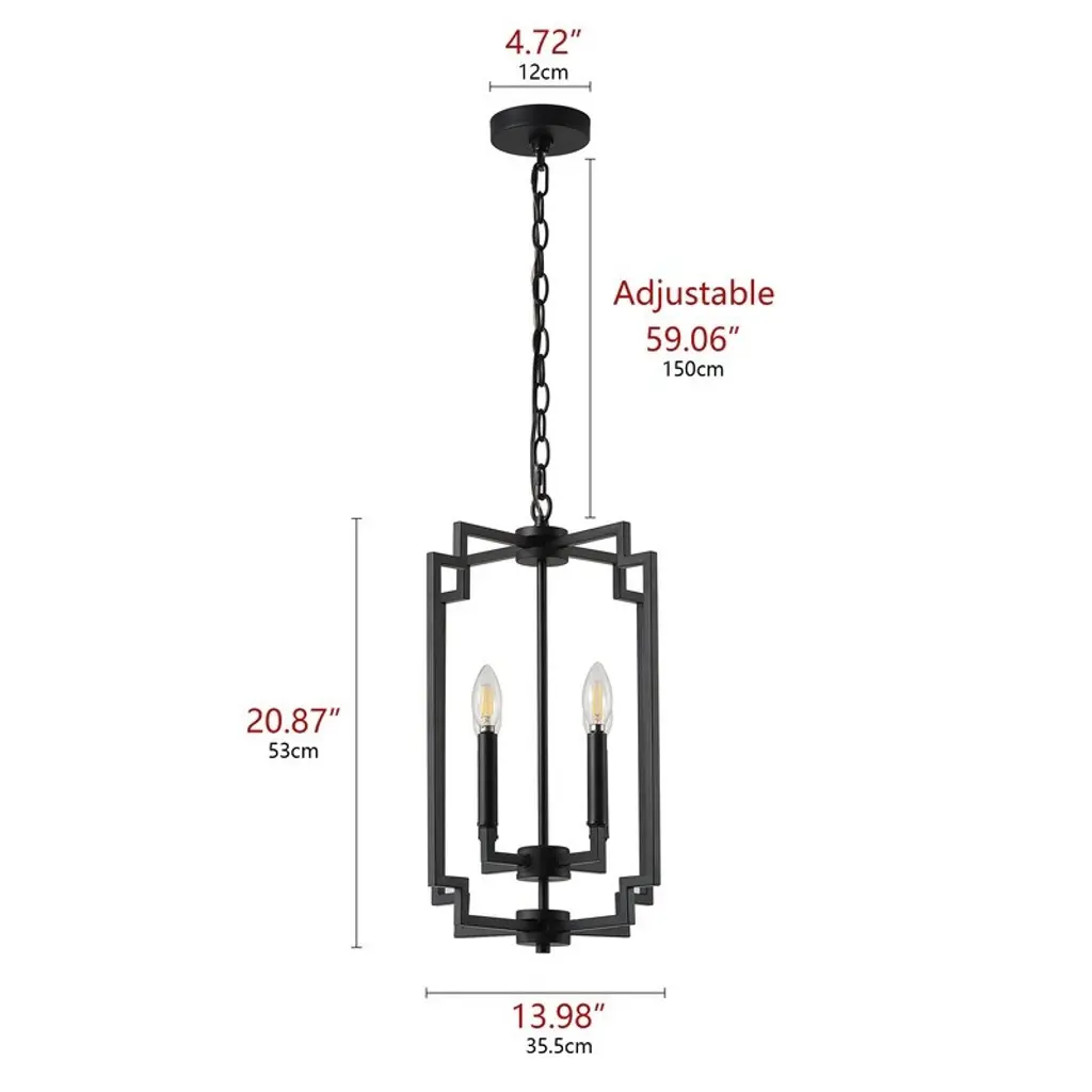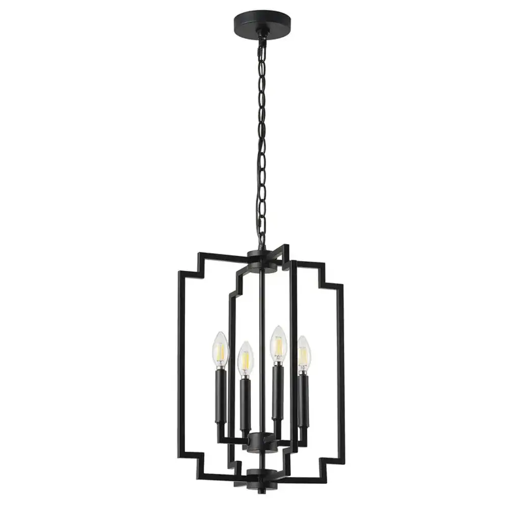 Specifications: Modern Industrial Design:This 4-light pendant chandelier features a sleek open cage frame in a matte black spray-painted finish, perfect for enhancing modern, industrial, or farmhouse interiors.Durable Iron Construction: Crafted from high-quality iron, including the canopy and frame, this fixture ensures long-lasting strength and stability.Easy to Assemble: Don't worry about the installation difficulty. It can be mounted facing up or down to suit your space and lighting needs.E12 Socket Compatibility: ETL Listed for your safety. The light is a built-in standard E12 socket, suggest using a dimmable E12*4 base bulb (Max 40W, 120V). Bulbs and dimmer switch not included.Widely Used: Ideal for dining rooms, entryways, kitchens, or stairwells, offering a bold statement and ample illumination without taking up visual space.