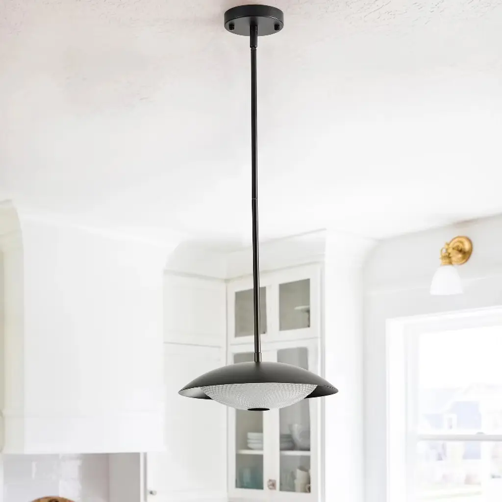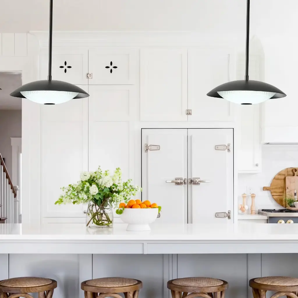 Bring modern elegance to your space with this matte black LED pendant light. Featuring a milky white glass shade and durable iron frame, it delivers 1200 lumens of bright 6500K daylight. The 24W built-in LED is dimmable via a compatible TRIAC wall switch, offering flexible lighting for kitchens, dining rooms, or entryways. ETL certified for safety and backed by a 2-year warranty, this fixture is both stylish and reliable.