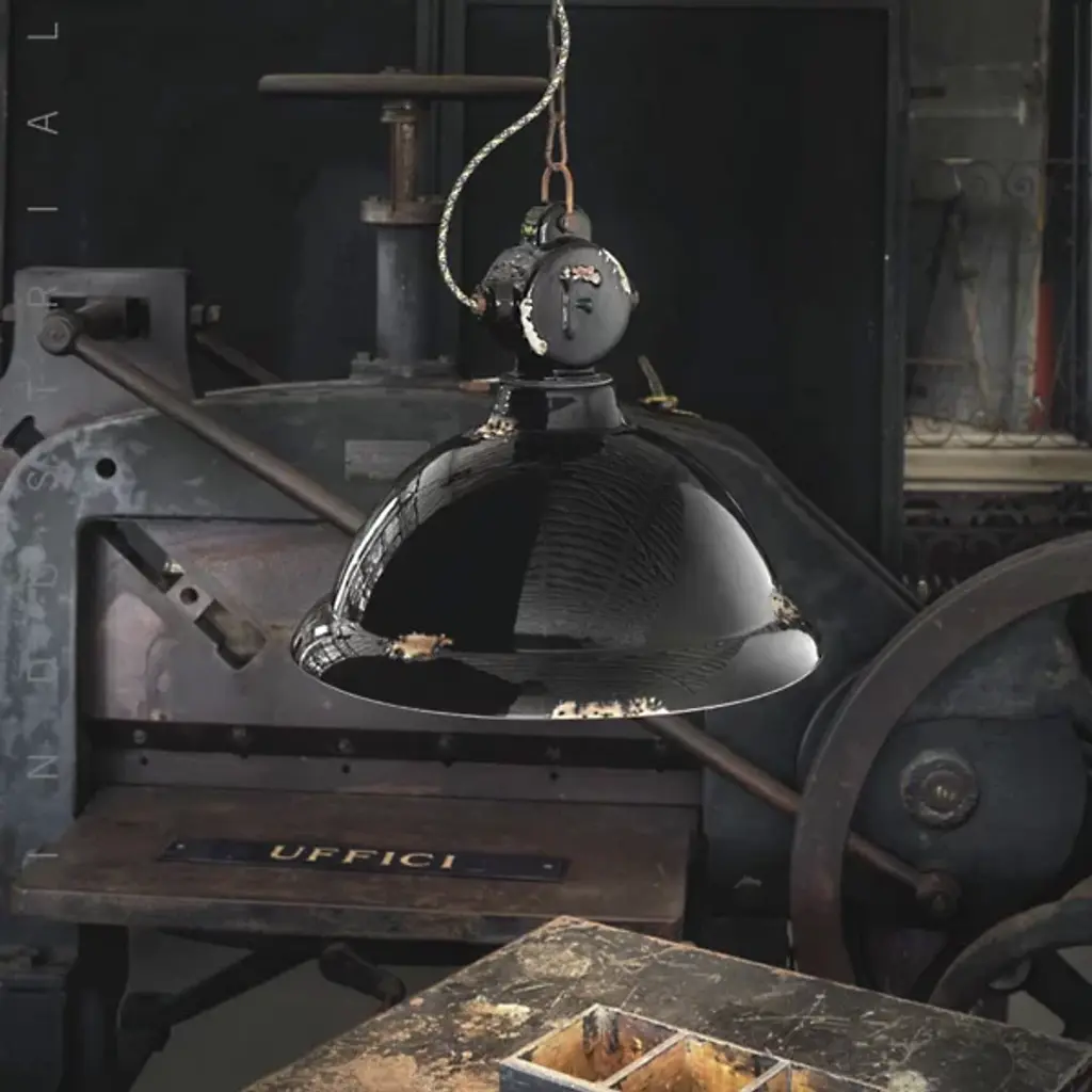 The Industrial Globe Pendant from Ferroluce splashes one’s room with an intimate light and a collection of gripping throwback motifs. This multi-layered piece underscores studio Ferroluce’s focus on honoring tradition and materials. Made from handcrafted ceramic, the generous dome shade and the canopy unite in their crisp finish and rust-like notes. The bold lamp socket above the shade sports an “F” in a traditional nod to the Italian brand name. A single bulb remains barely visible to minimize glare. The bulb turns on to produce a warm, relaxed downlight.