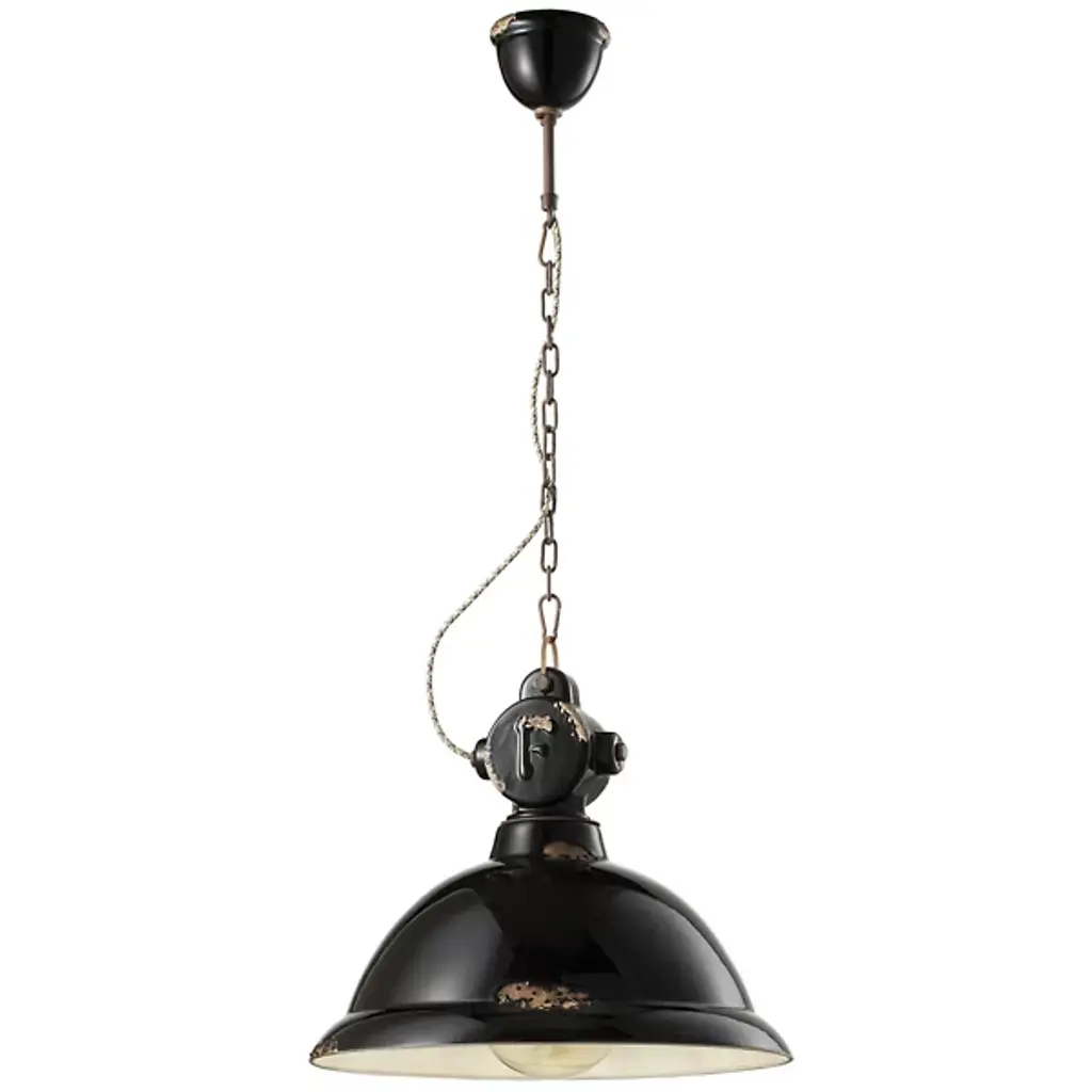 The Industrial Globe Pendant from Ferroluce splashes one’s room with an intimate light and a collection of gripping throwback motifs. This multi-layered piece underscores studio Ferroluce’s focus on honoring tradition and materials. Made from handcrafted ceramic, the generous dome shade and the canopy unite in their crisp finish and rust-like notes. The bold lamp socket above the shade sports an “F” in a traditional nod to the Italian brand name. A single bulb remains barely visible to minimize glare. The bulb turns on to produce a warm, relaxed downlight.