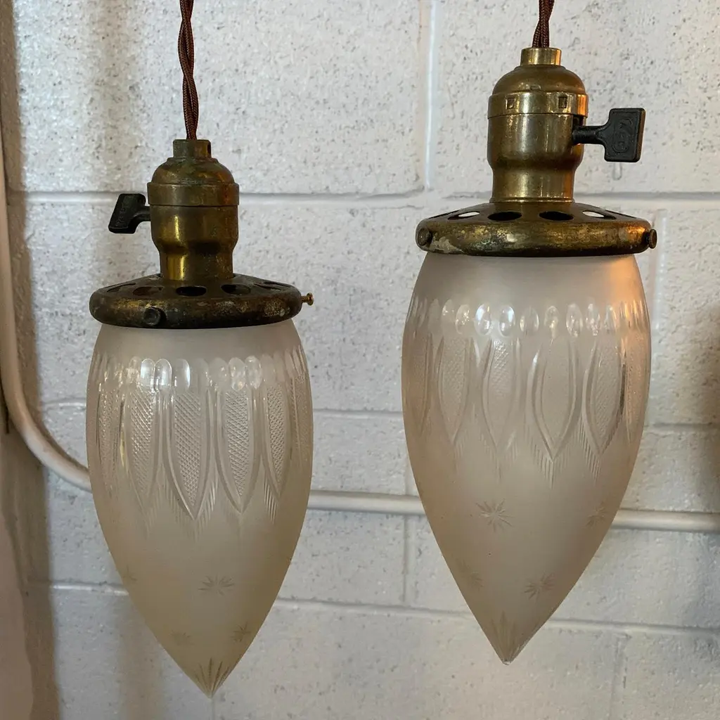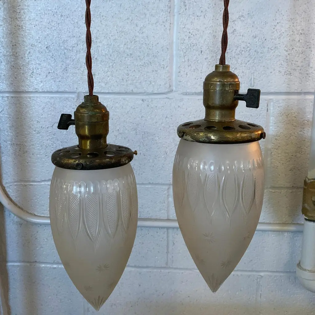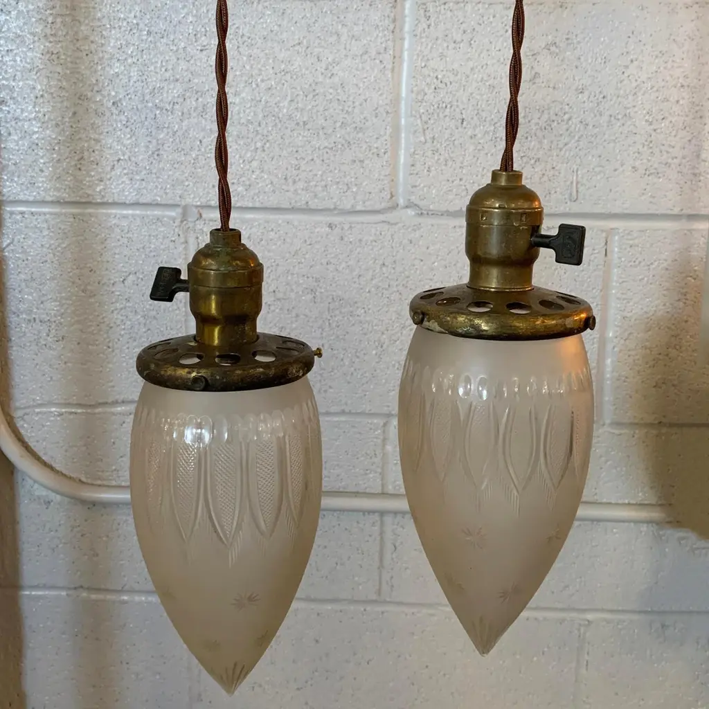 Antique, industrial pendant light features a late 19th century, etched glass, teardrop-shaped shade with brass switch fitter. The pendant is newly wired with 40 inches of braided cloth cord to accept up to a 75 watt bulb. Sold individually, 5 available.